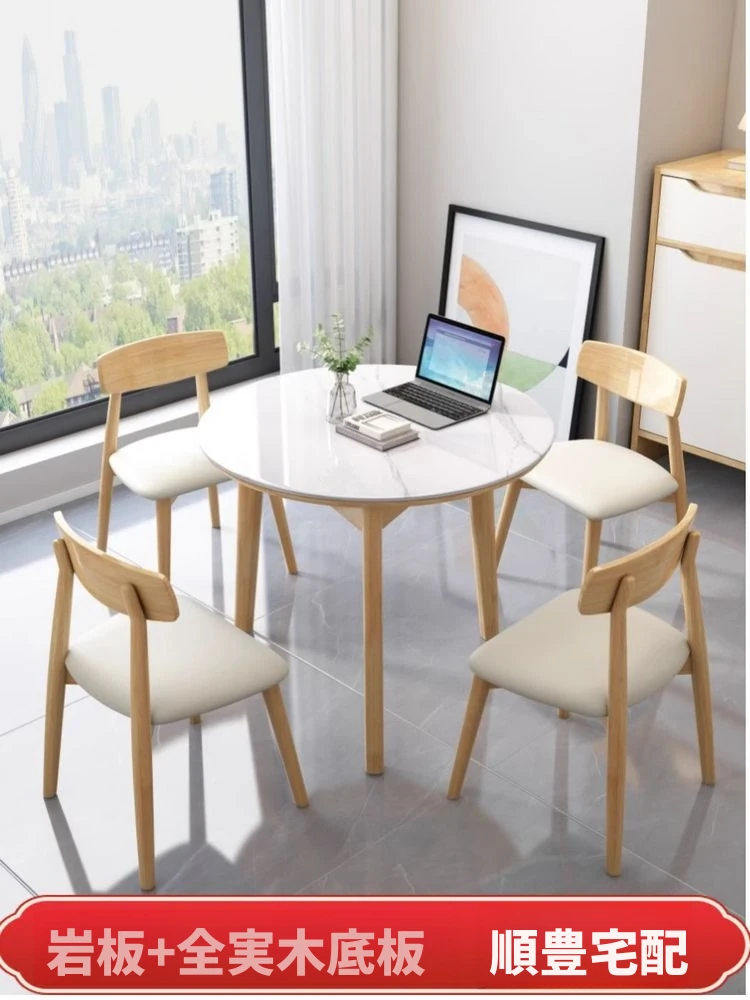 北欧スタイルの軽奢華でシンプルな現代的クリームカラーの円形岩板ダイニングテーブルとチェアセット - 小スペースにも最適、バルコニーやリビングでのくつろぎタイムにぴったり!