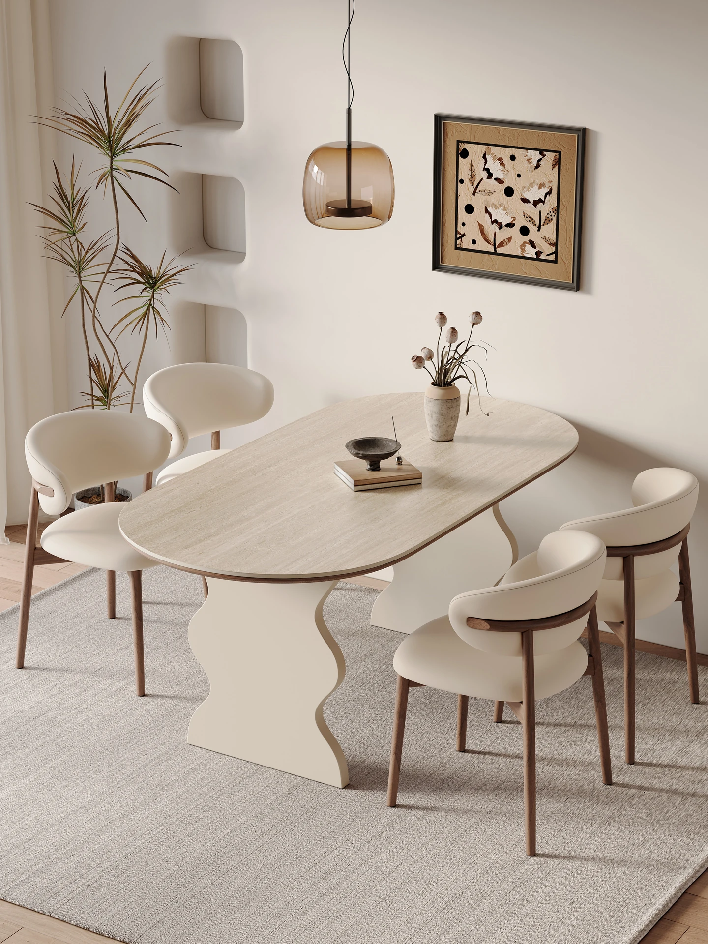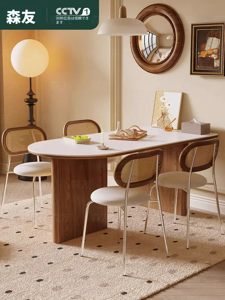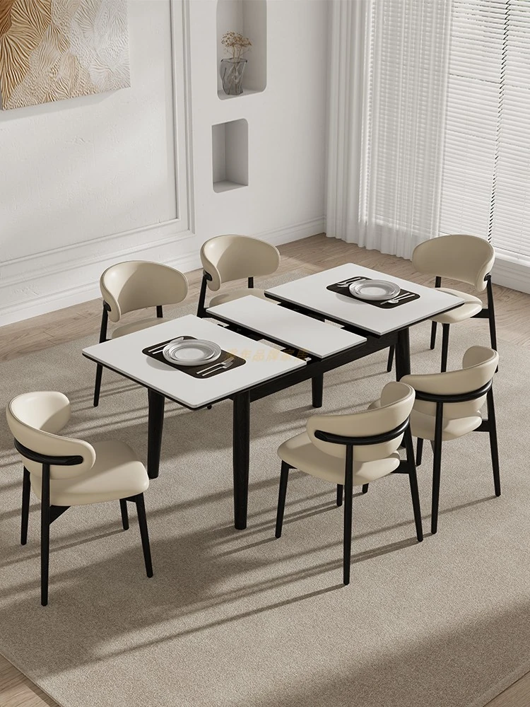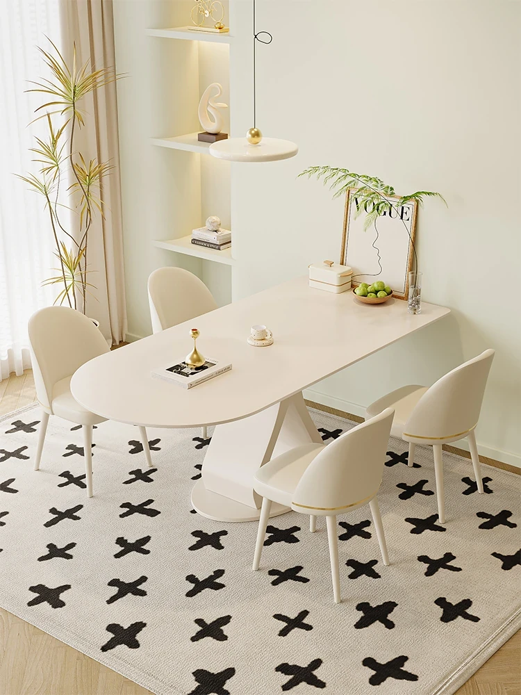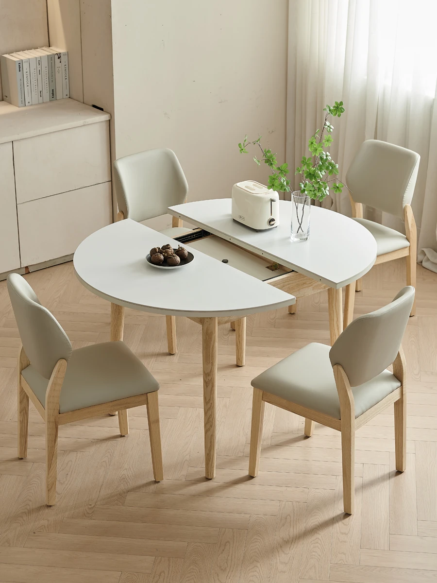 フレンチクリーム風の岩板ダイニングテーブルセット - モダンでシンプルなデザイン、狭いスペースにもぴったりな半円形テーブル。軽やかな高級感で、家庭での食事をもっと特別に!