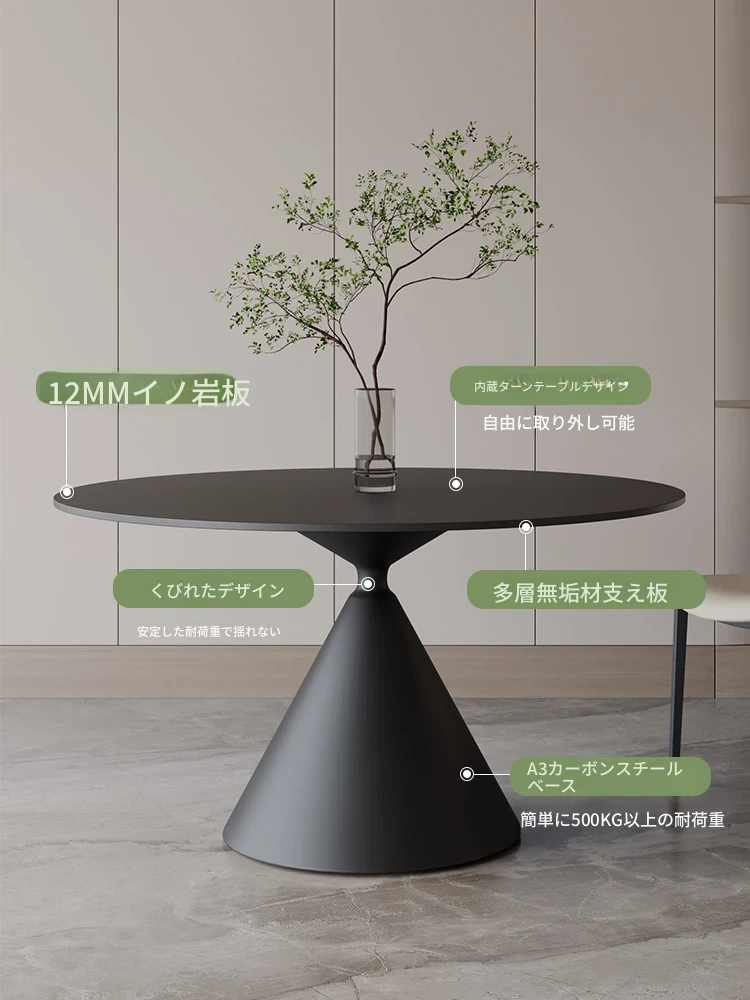 ホワイトラウンド岩板ダイニングテーブル|シンプルなブラックラウンドテーブル|小型家庭向け内蔵ターンテーブル付き|おしゃれで実用的な食卓を実現!