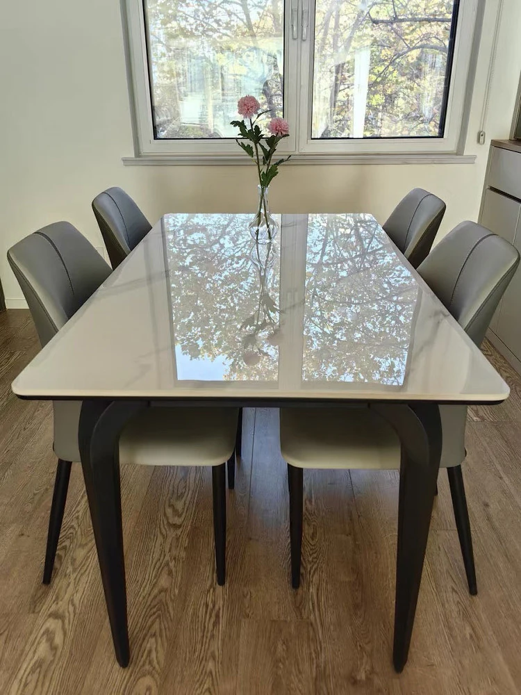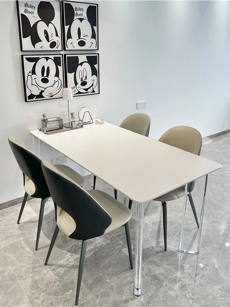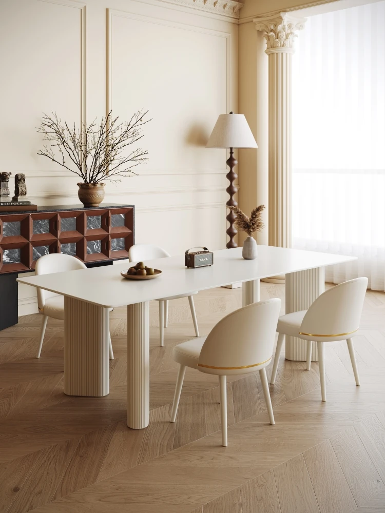 クリーム風の純白岩板ダイニングテーブル - 小さな家に最適なスタイリッシュな長方形デザイン!トレンディな軽奢スタイルで、モダンでシンプルな椅子との組み合わせ。おしゃれで快適な食卓を演出します。