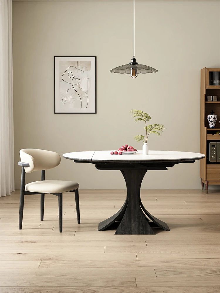 実木製のロックストーンダイニングテーブルセット | 折りたたみ式で便利!モダンなリビングにぴったりの多機能長方形テーブル、円形にも変形可能!家庭に最適なスタイリッシュな選択。