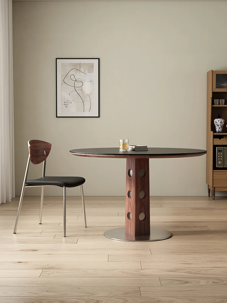 CURIETAN ライム 中古風洞石岩板ダイニングテーブル 丸型 無垢材 家庭用 小型住宅向け 回転プレート付きの食卓