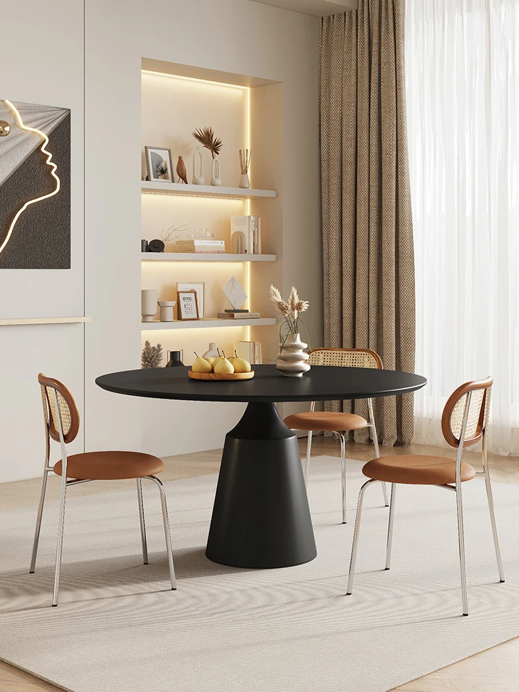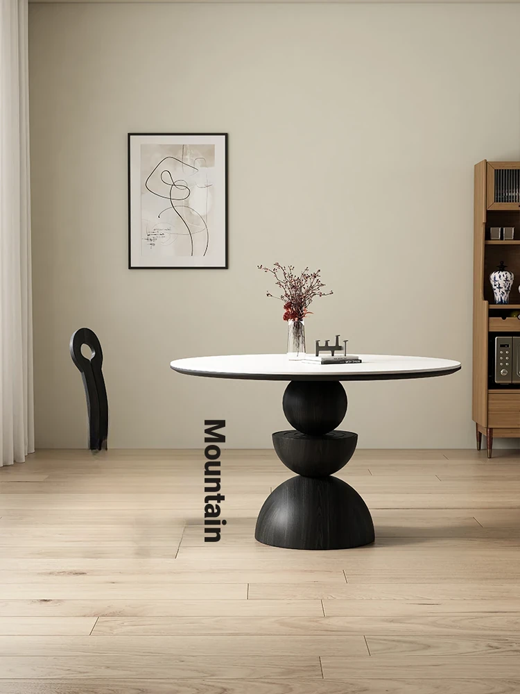 Modern Cream Round Dining Table Set with Roman Column Design - Perfect for Small Spaces, Featuring Elegant Rock Slab Surface for Stylish Conversations and Dining Experiences.