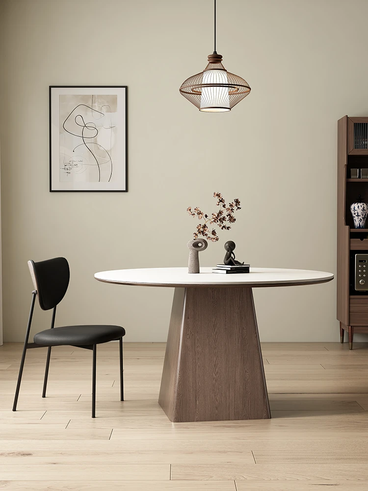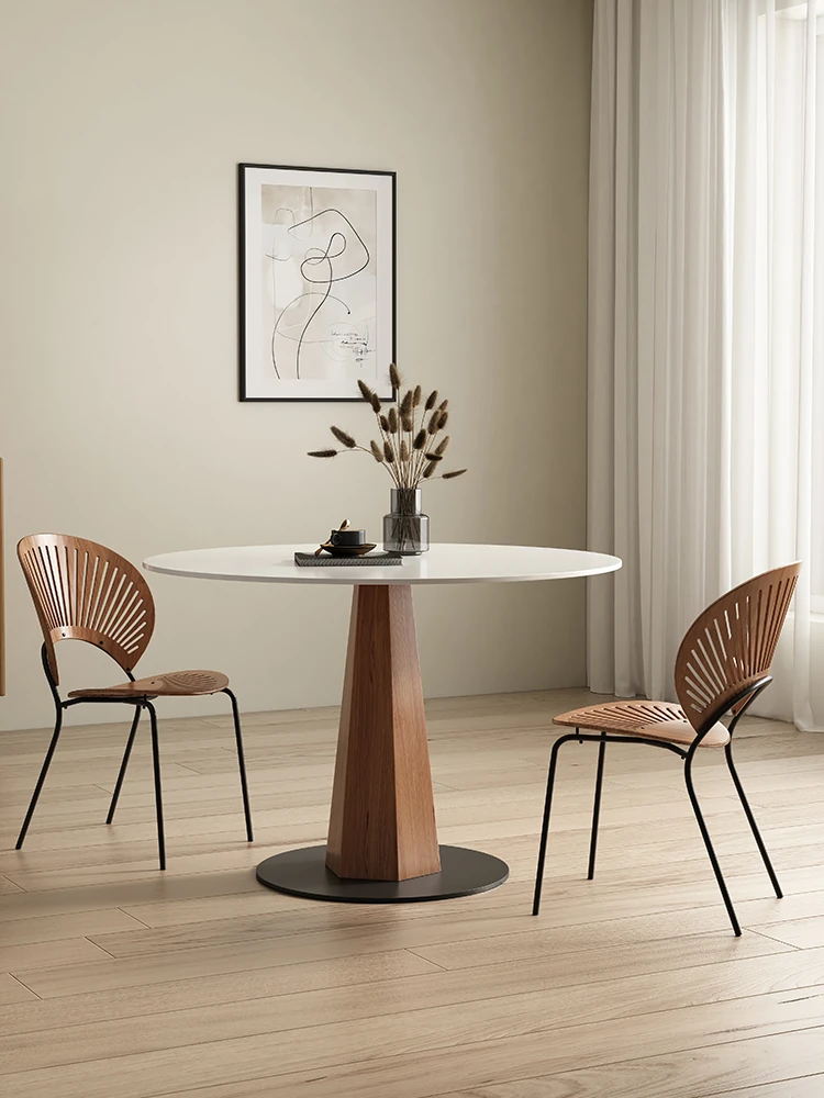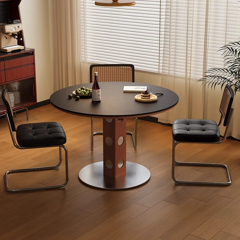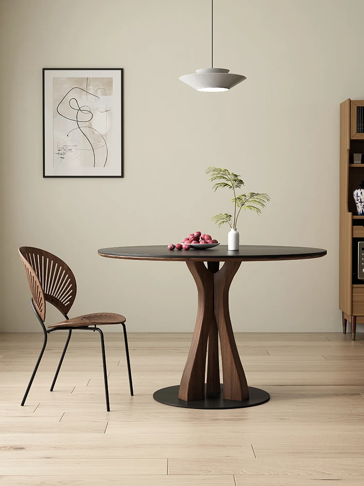 Vintage Black Walnut Round Dining Table - Minimalist Solid Wood Design for Small Spaces, Featuring Elegant Black Derifeng Rock Plate Top - Perfect for Modern Homes