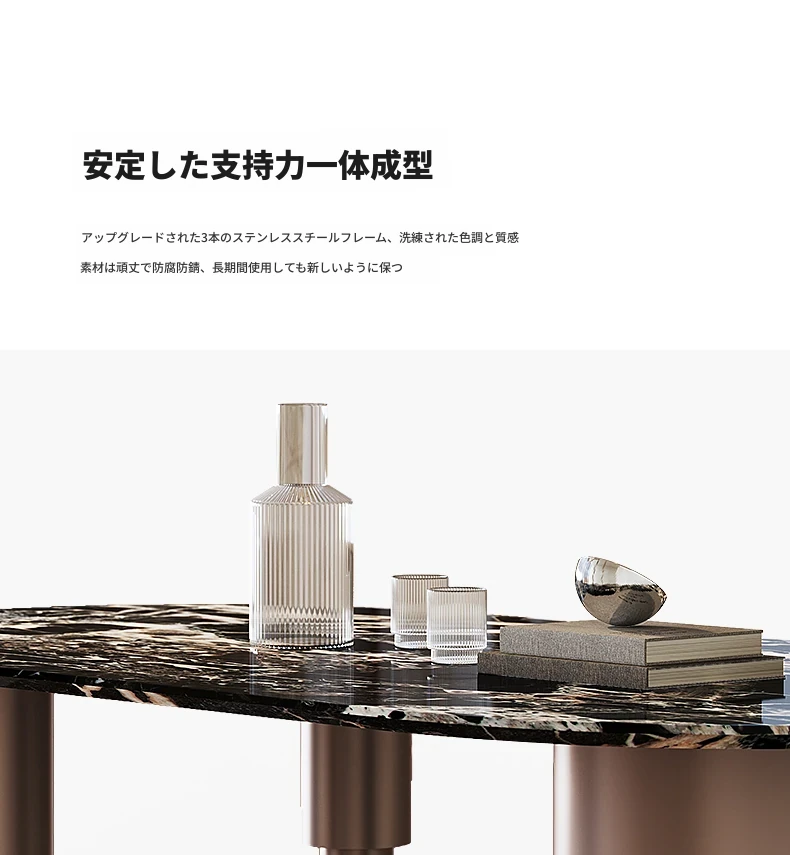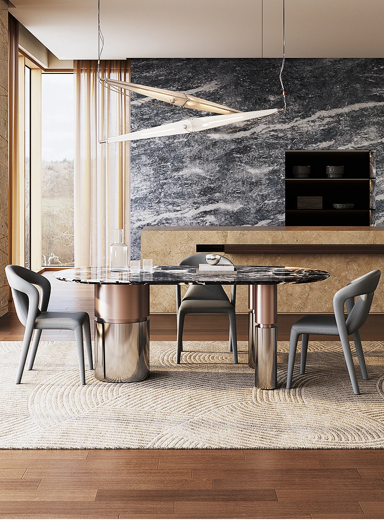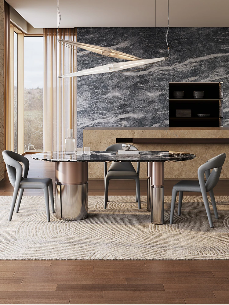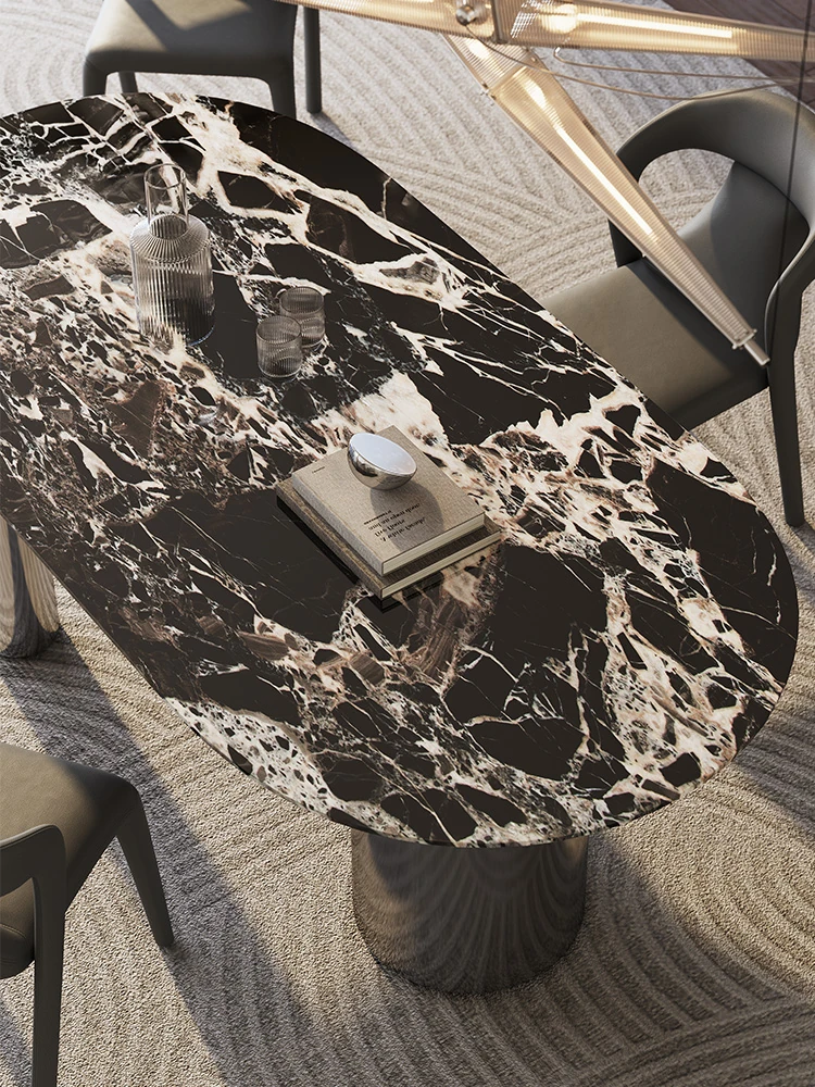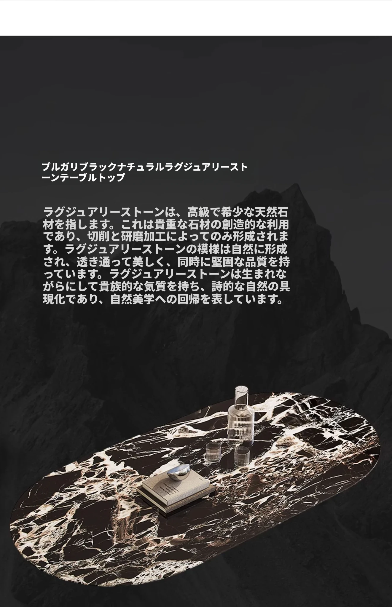 2025年新作!軽やかさと高級感を兼ね備えた天然石製ダイニングテーブル。洗練されたミニマルデザイン、別荘やオフィス、家庭にぴったりなロングオーバル型。おしゃれな空間を演出します!