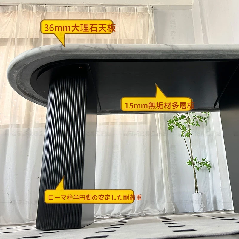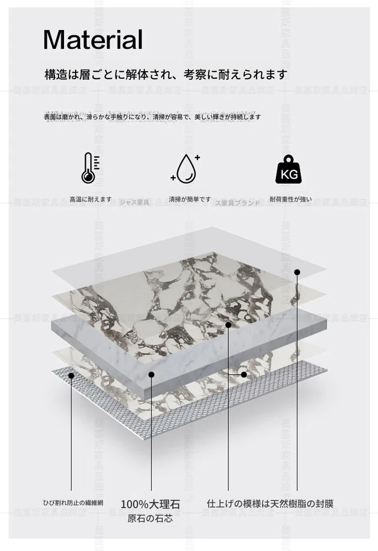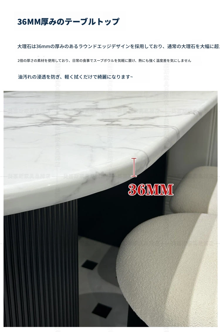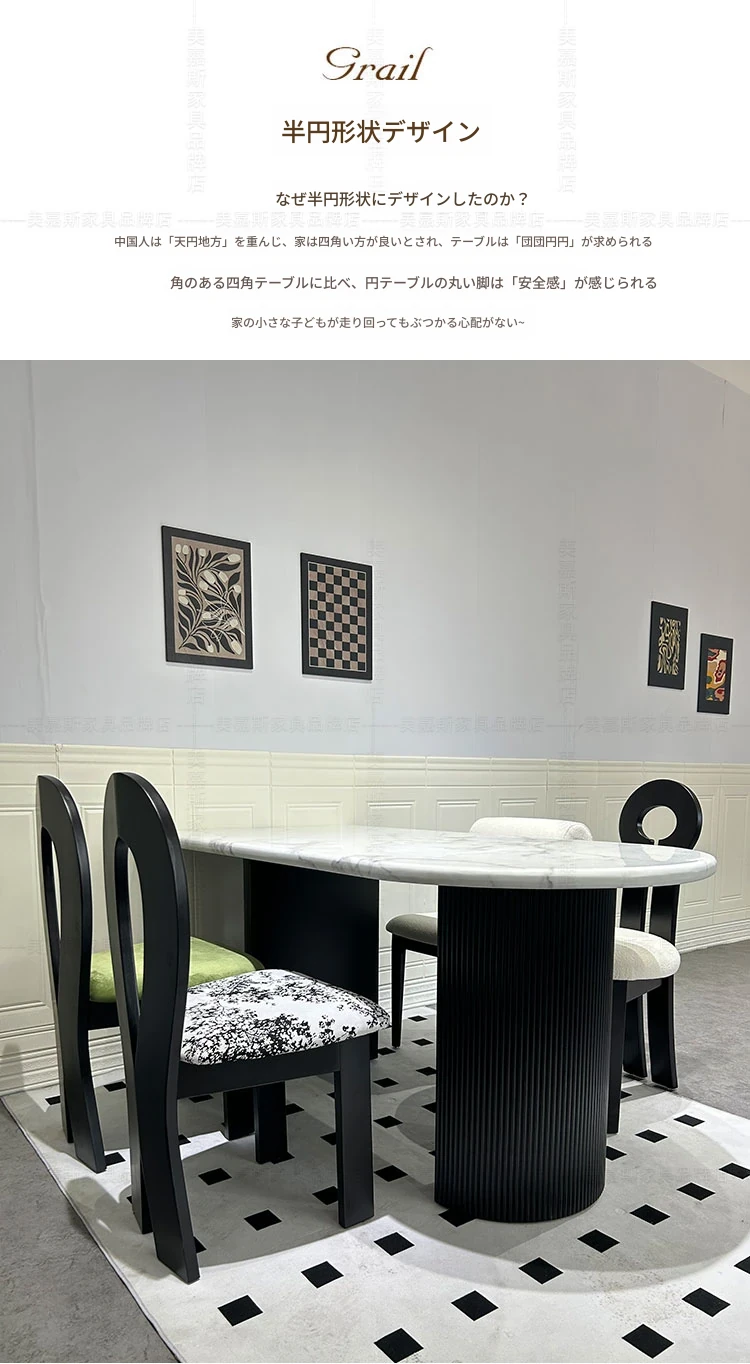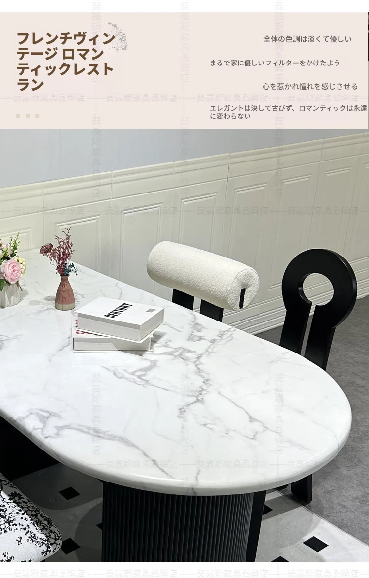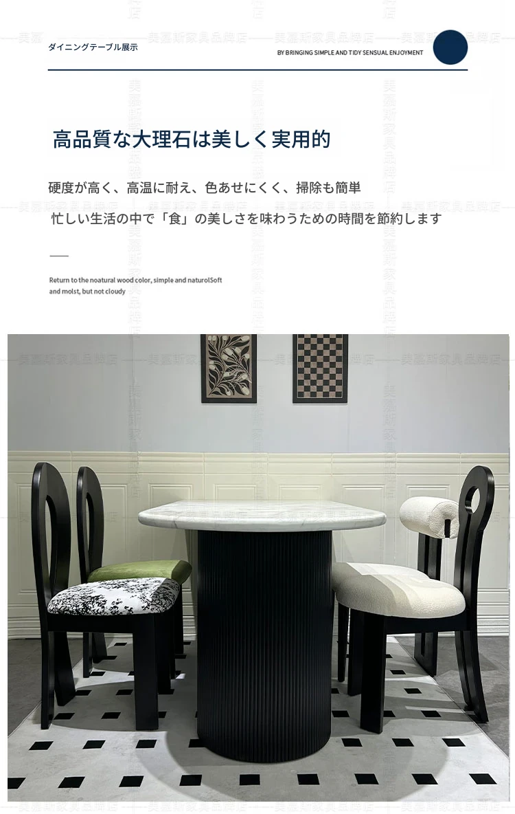 クリーミーな大理石のダイニングテーブル - 一方は円形、もう一方は角形のデザイン。小さなスペースでも活躍する大花模様のスタイリッシュな半円型テーブル。家族団らんや友人との食事に最適!