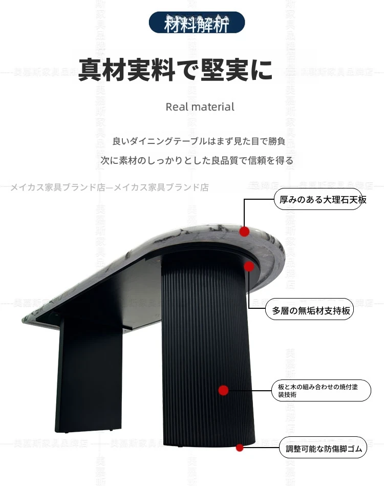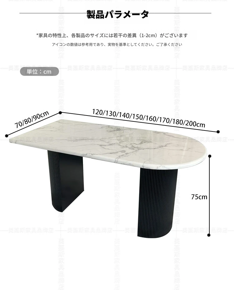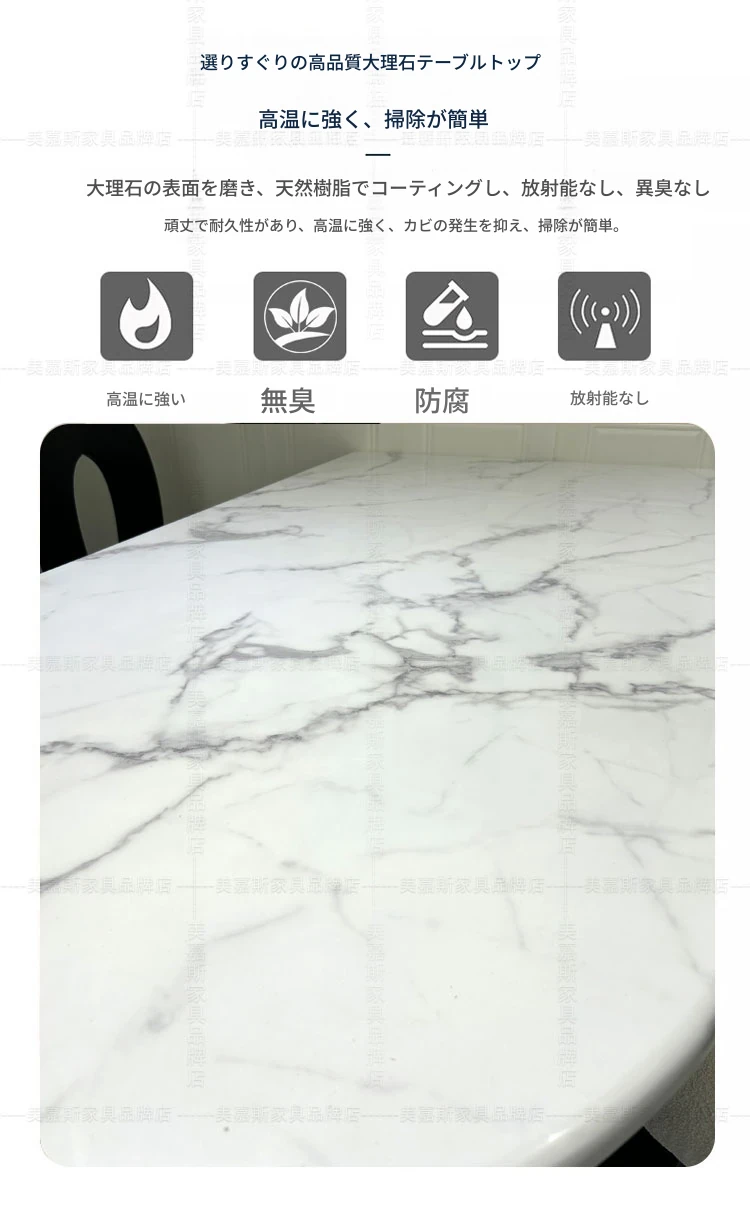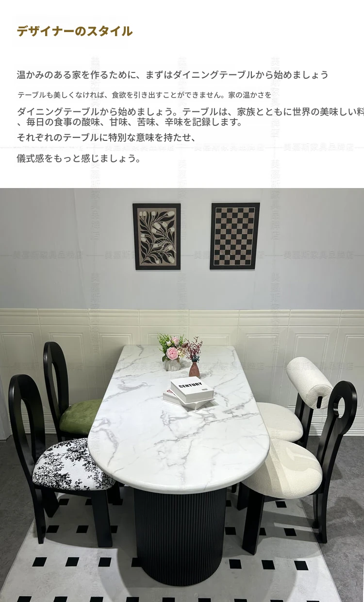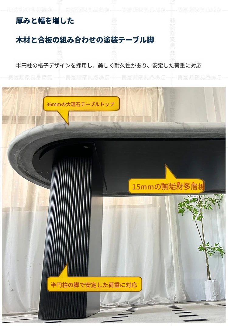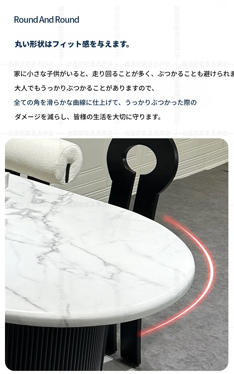 クリーミーな大理石のダイニングテーブル - 一方は円形、もう一方は角形のデザイン。小さなスペースでも活躍する大花模様のスタイリッシュな半円型テーブル。家族団らんや友人との食事に最適!
