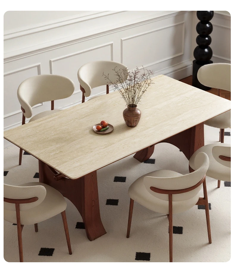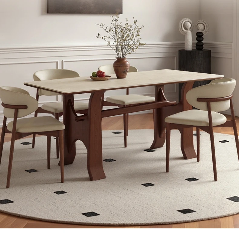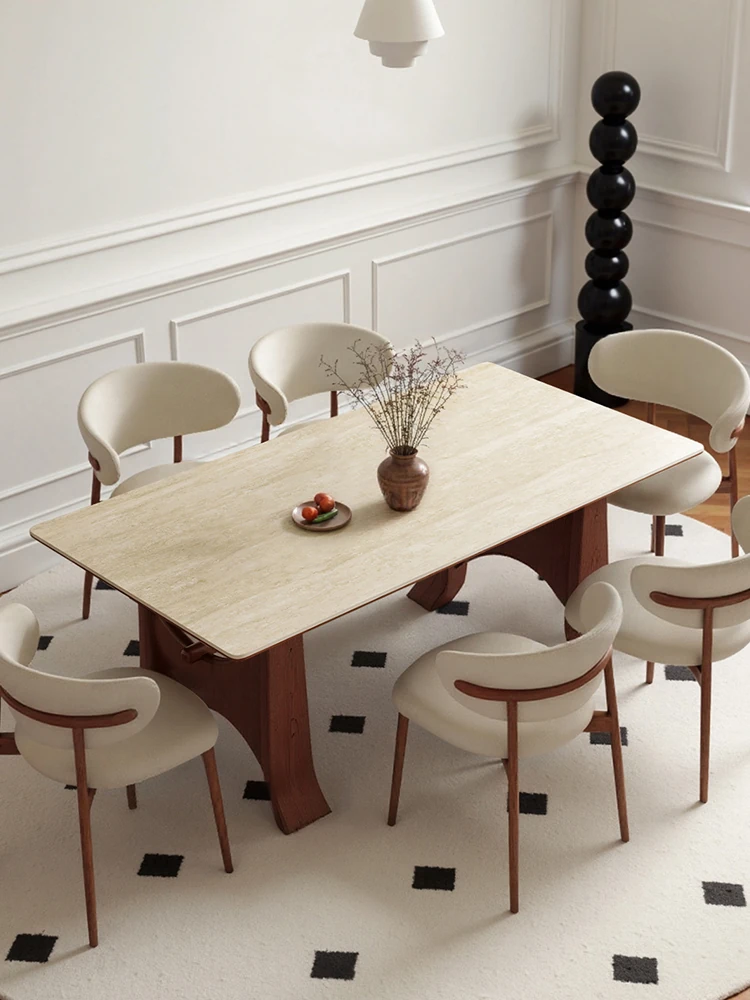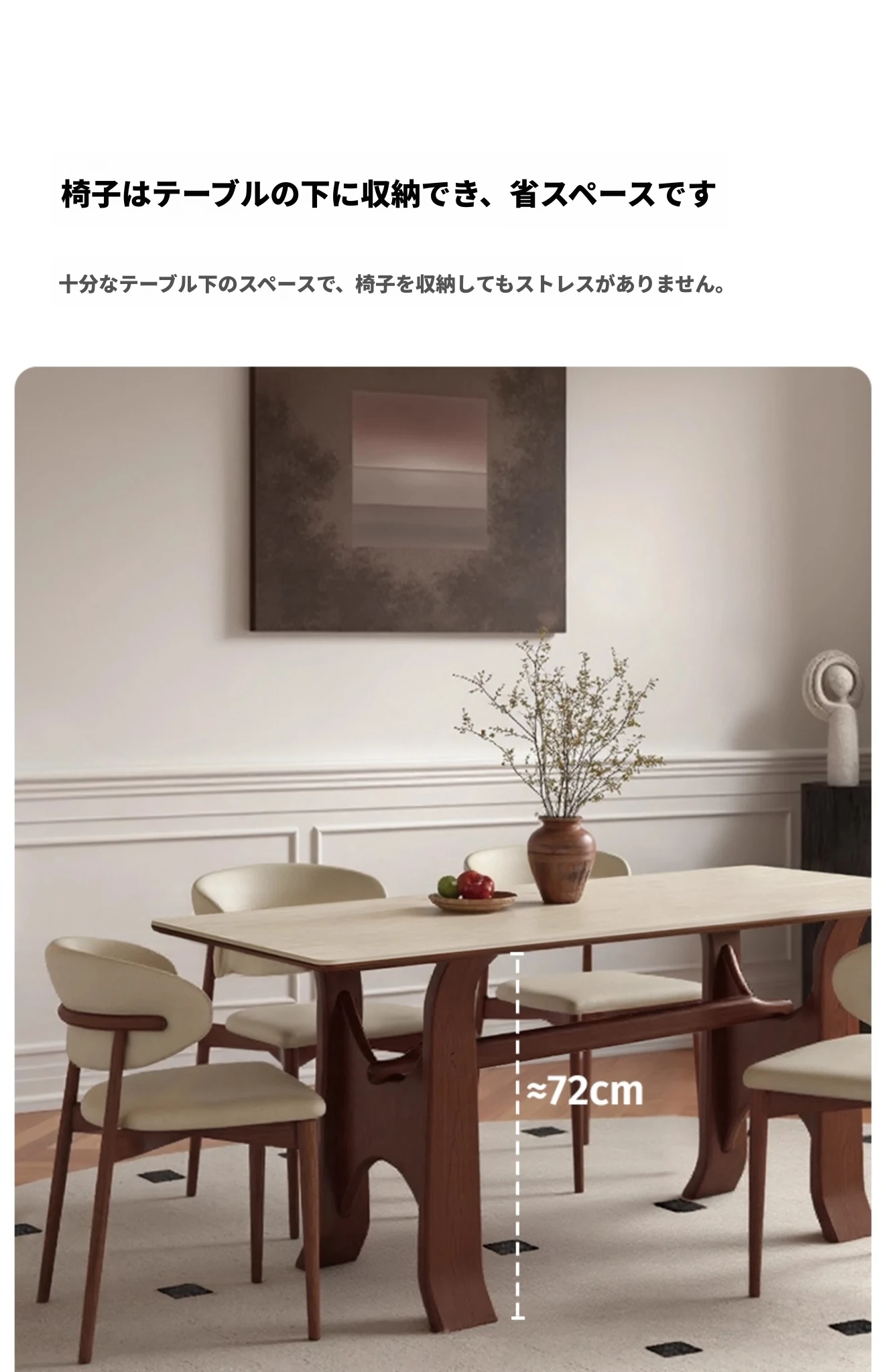 CURIETAN 希沓 レトロな木の質感が魅力的!長方形の洞石岩板を使用した胡桃色のダイニングテーブル - 小スペースに最適なヴィンテージスタイルの実木テーブル!