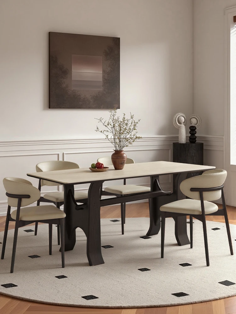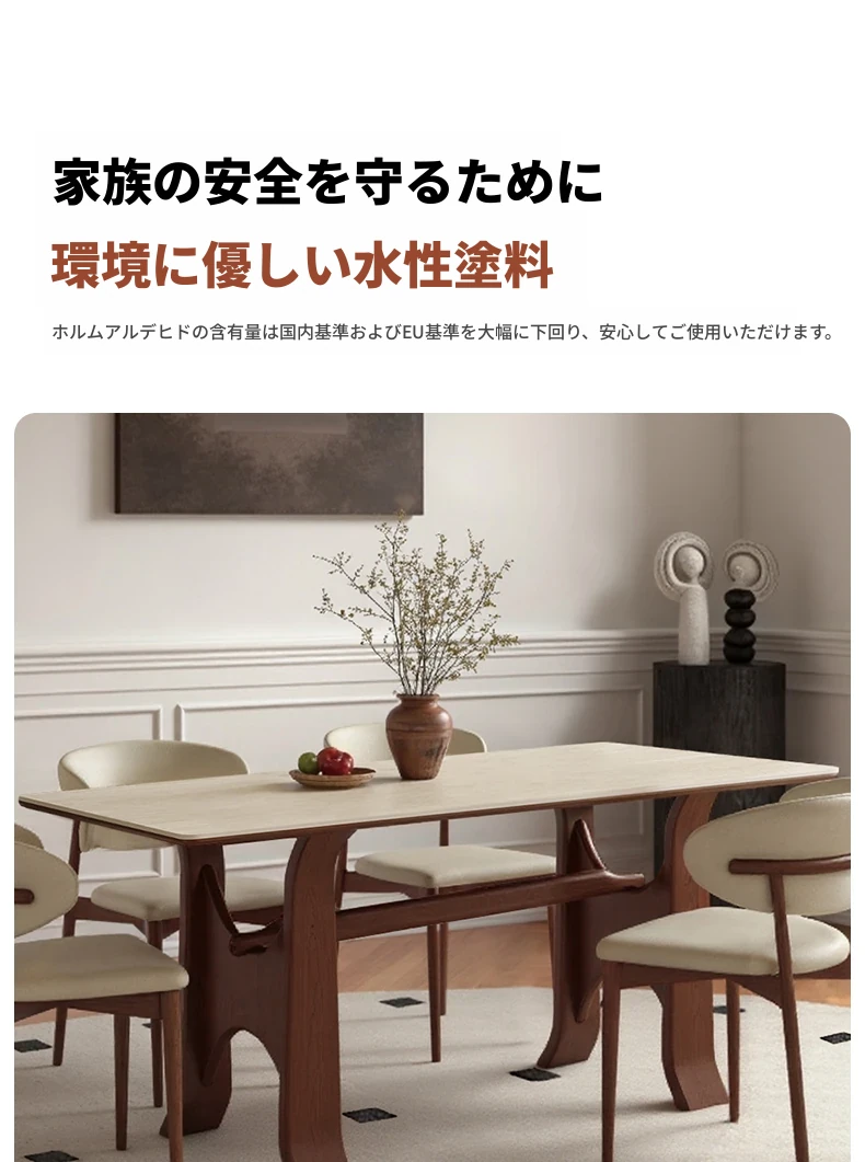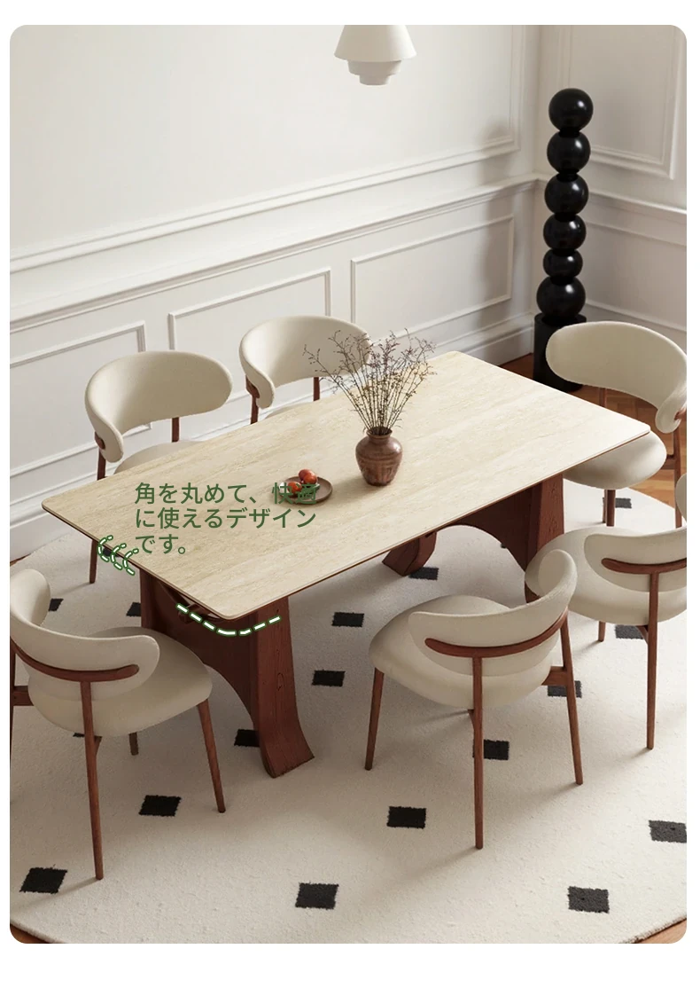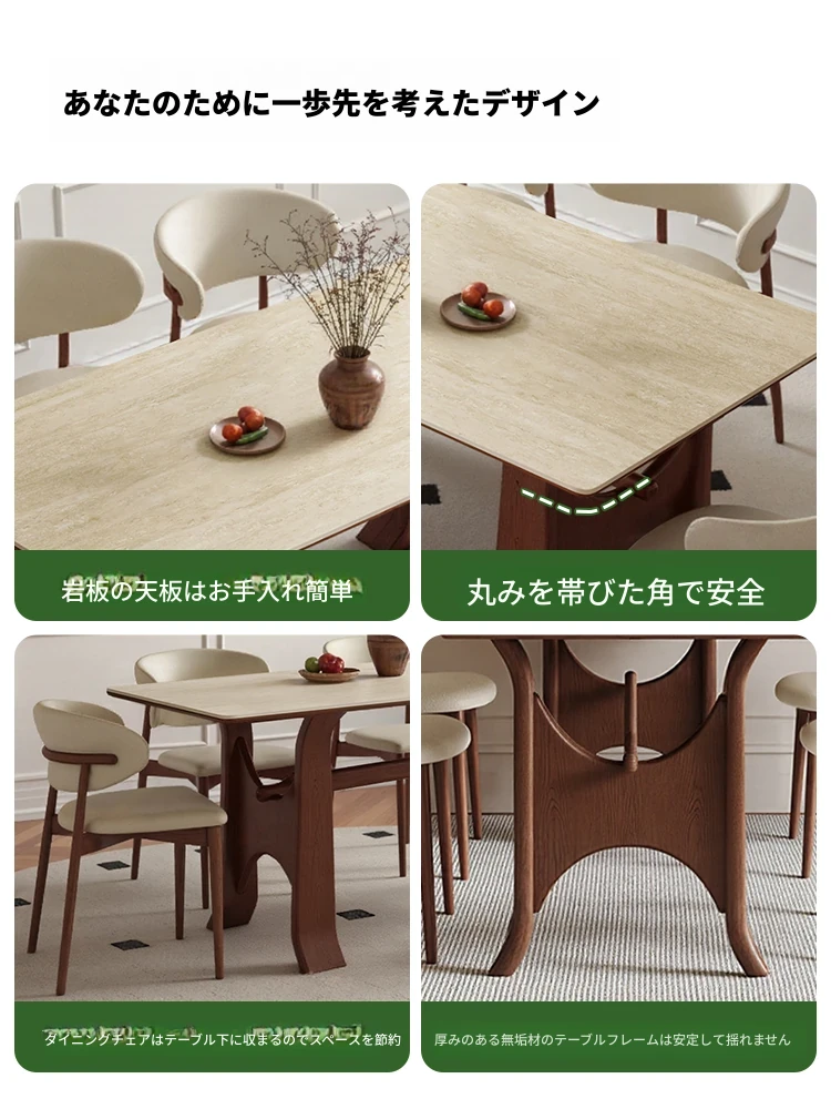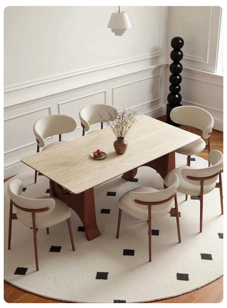 CURIETAN 希沓 レトロな木の質感が魅力的!長方形の洞石岩板を使用した胡桃色のダイニングテーブル - 小スペースに最適なヴィンテージスタイルの実木テーブル!