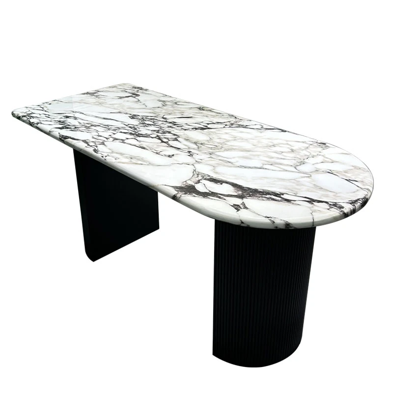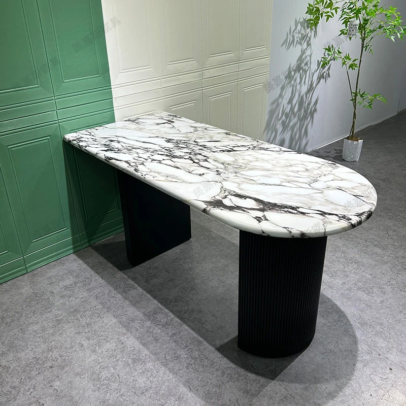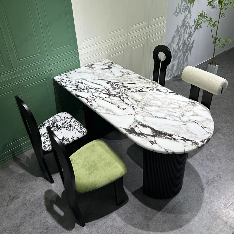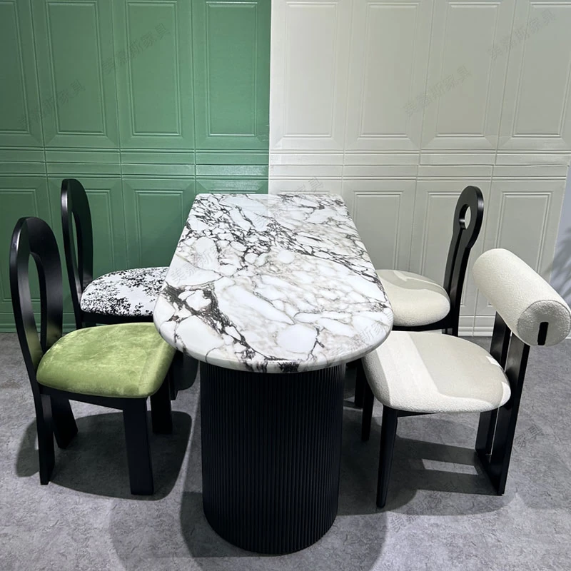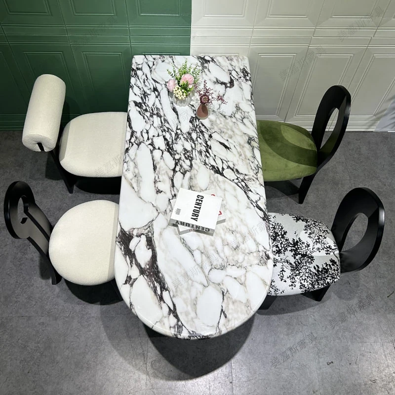 フレンチヴィンテージ風のブルガリ大理石ダイニングテーブル - コンパクトな小型住宅に最適な半円形・楕円形の壁付けテーブルとチェアセット。おしゃれで実用的な空間を演出します!
