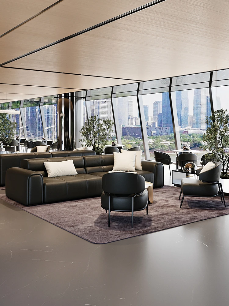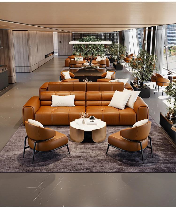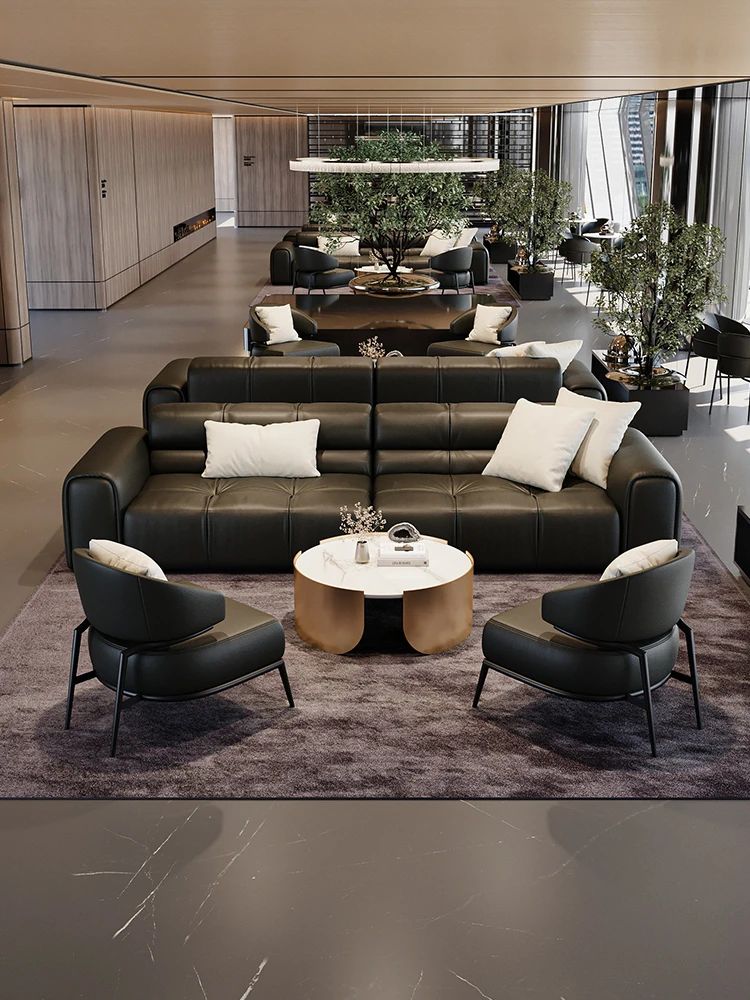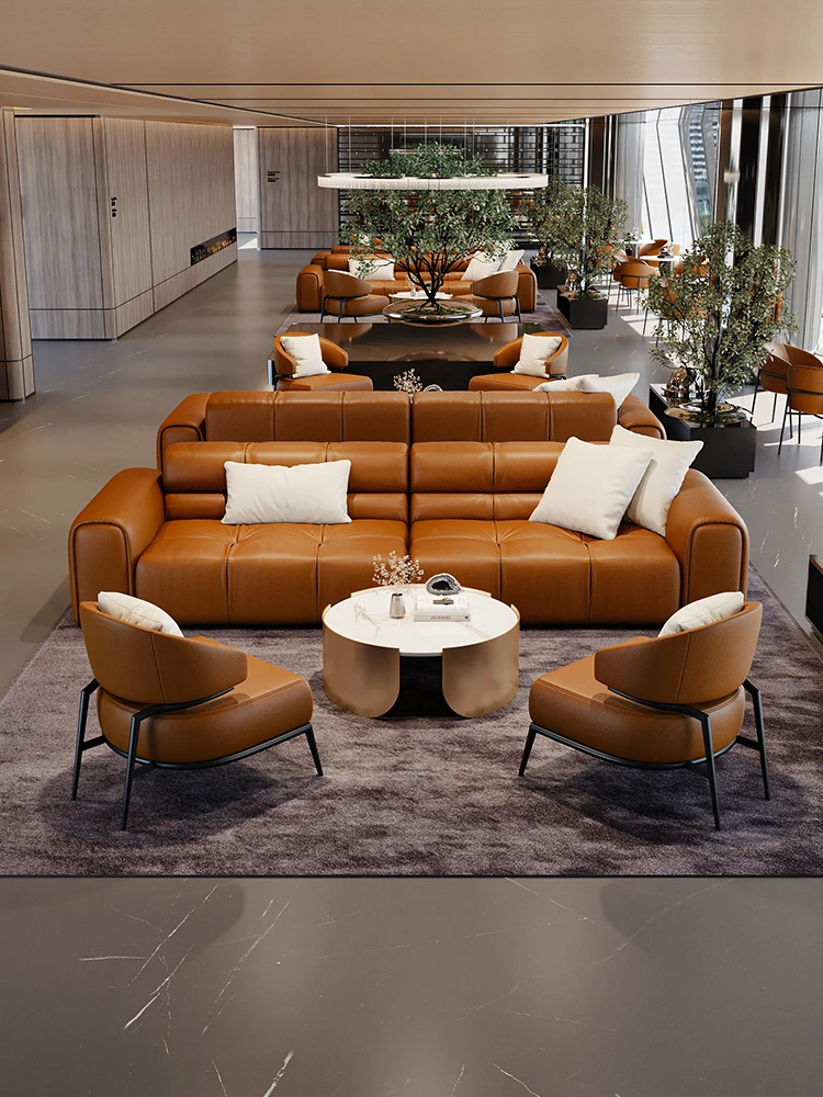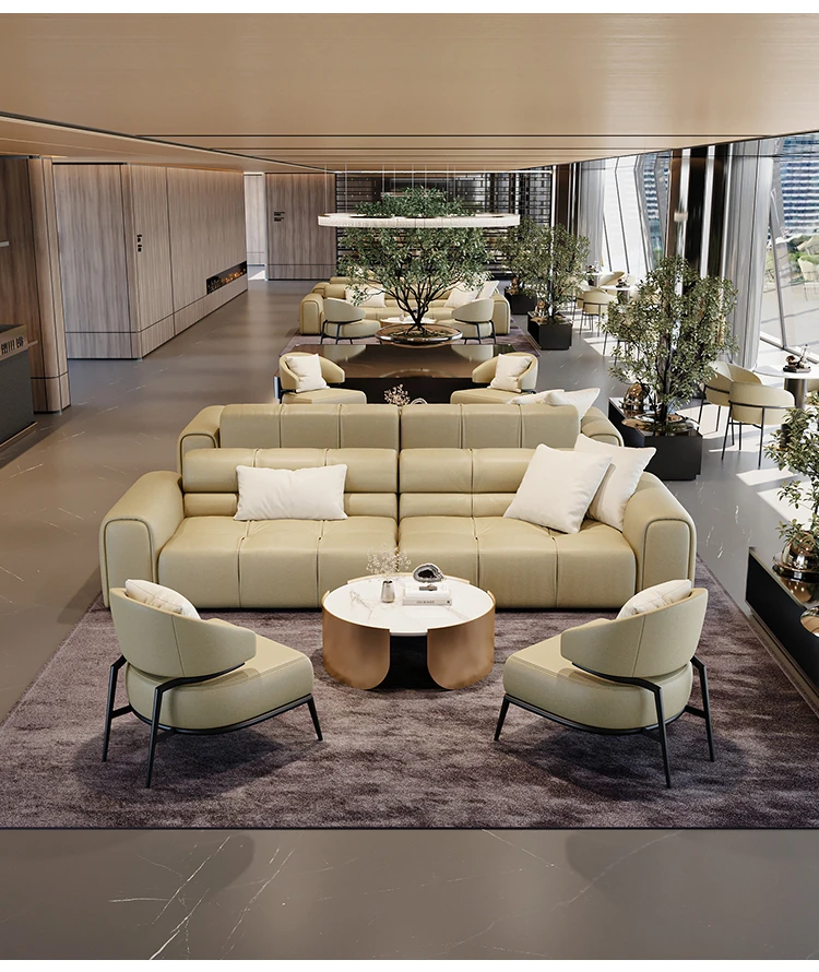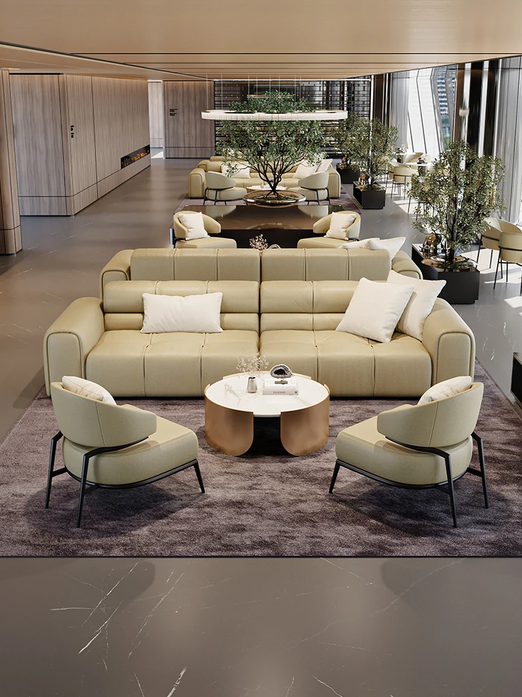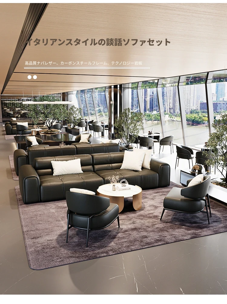 イタリアンミニマル高級レザーソファセット - モダンでシンプルなデザイン、ホテルロビーやオフィスの接待・談話に最適!快適さとスタイルを兼ね備えた一品。