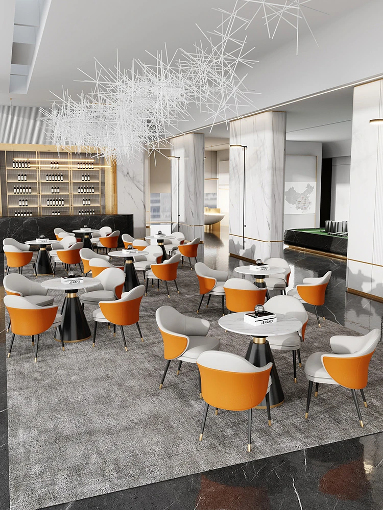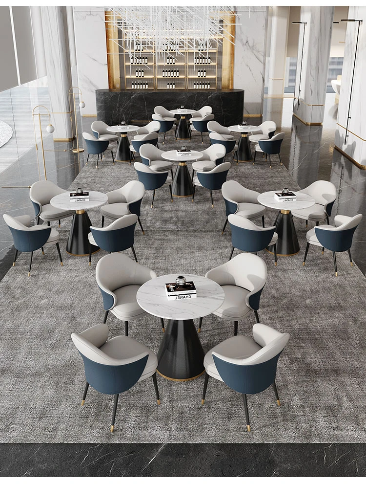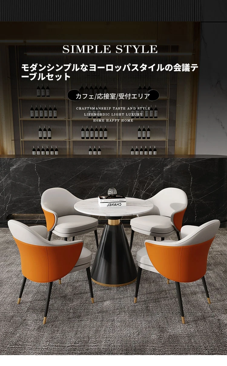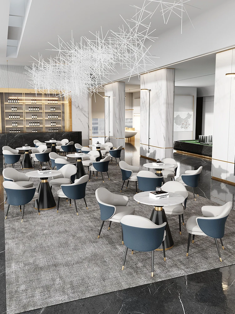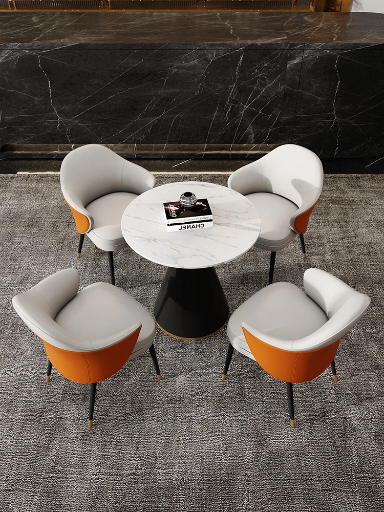 高級感あふれる軽奢スタイルの商談テーブルセット!現代的なホテルにぴったりな天然石製の小丸テーブルと4脚の椅子で、ビジネスミーティングをスタイリッシュに演出します。快適さと洗練されたデザインを兼ね備えた一品です。