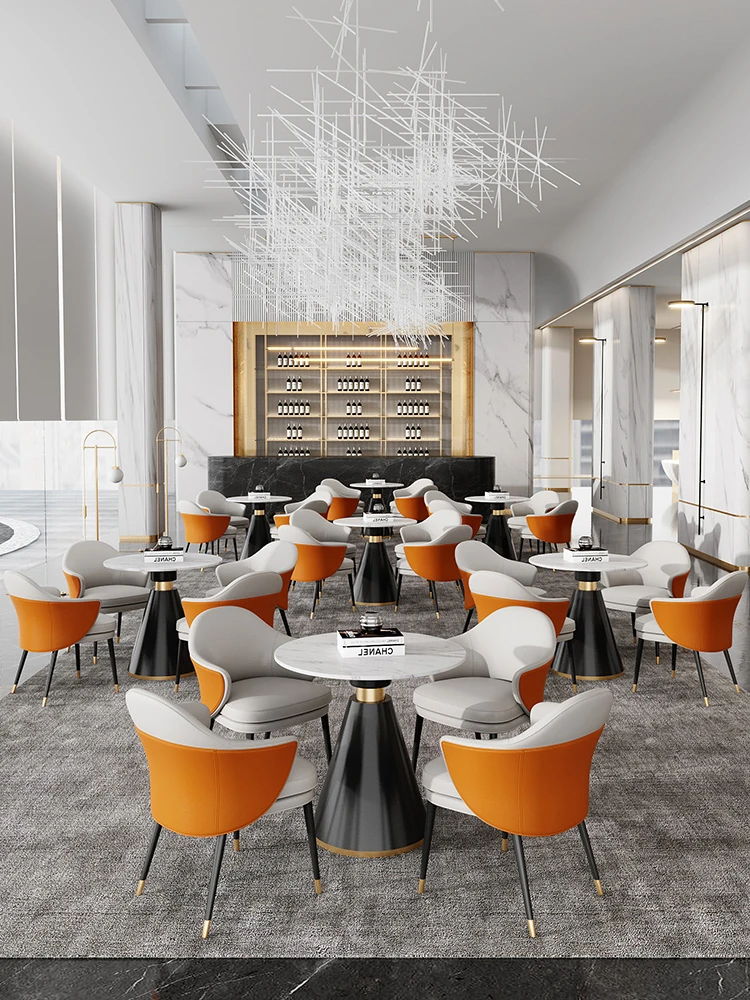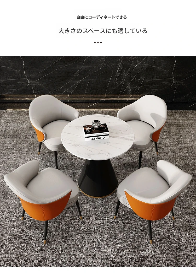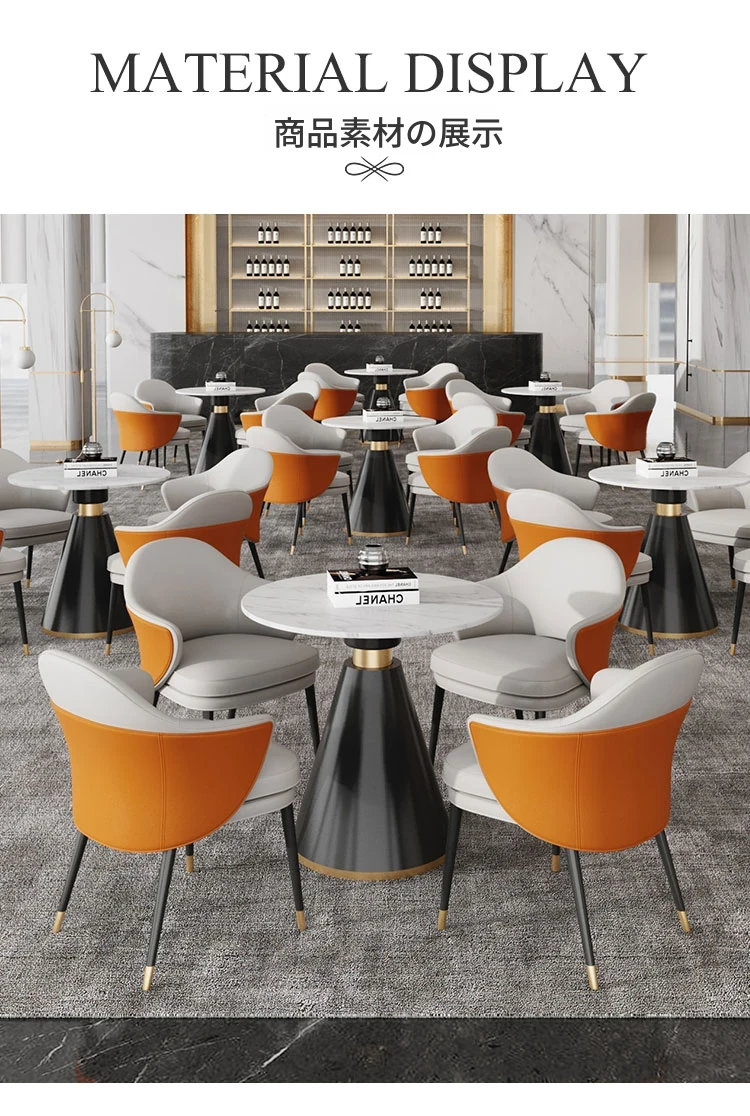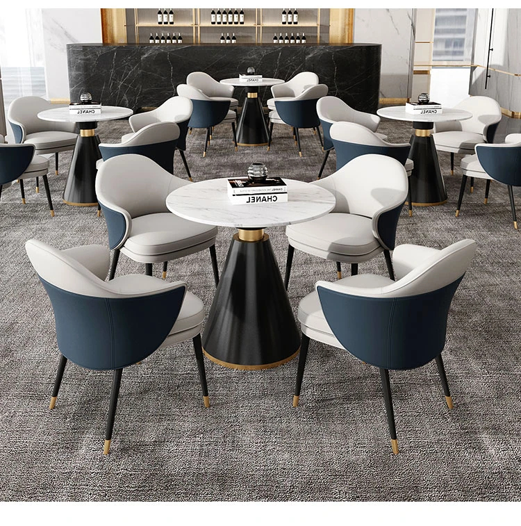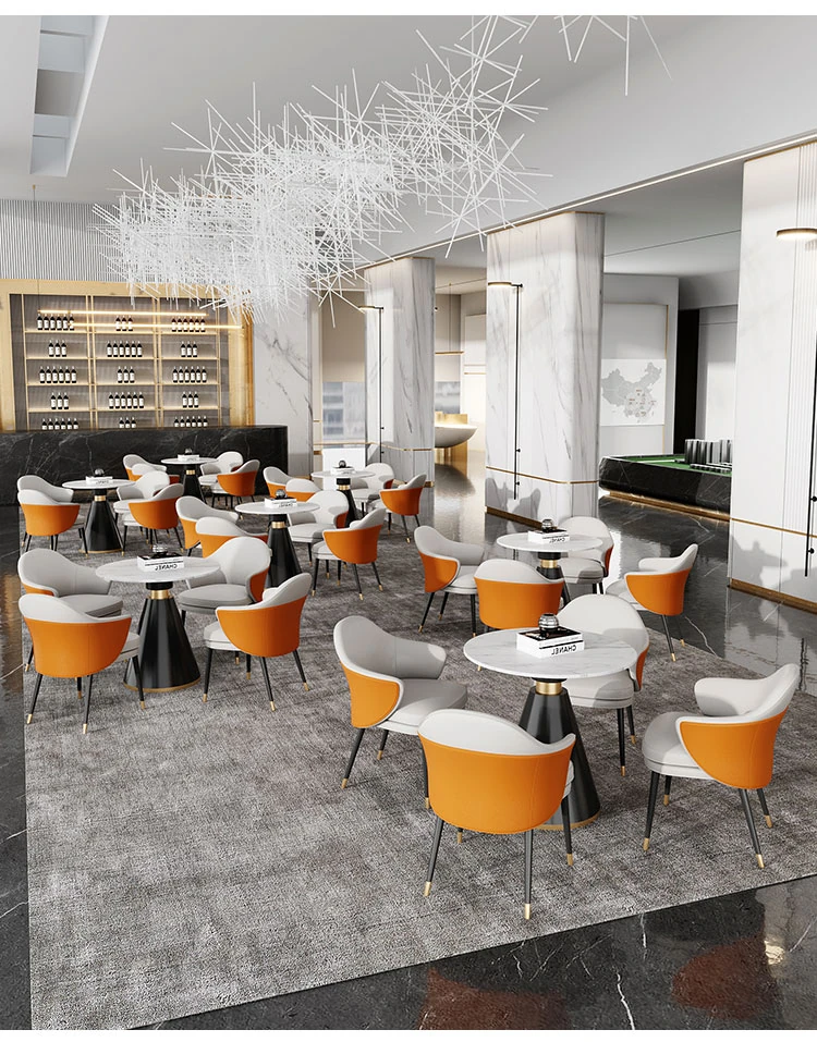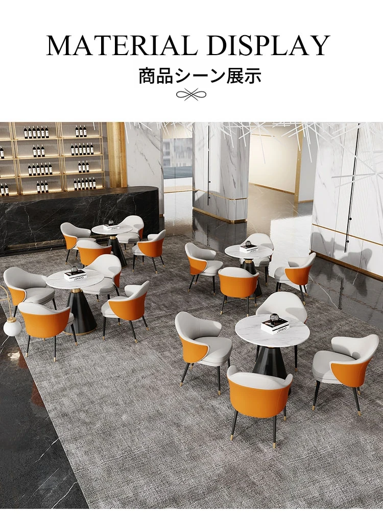 高級感あふれる軽奢スタイルの商談テーブルセット!現代的なホテルにぴったりな天然石製の小丸テーブルと4脚の椅子で、ビジネスミーティングをスタイリッシュに演出します。快適さと洗練されたデザインを兼ね備えた一品です。