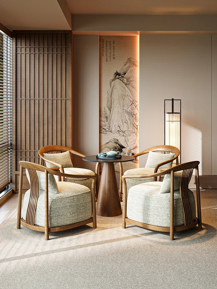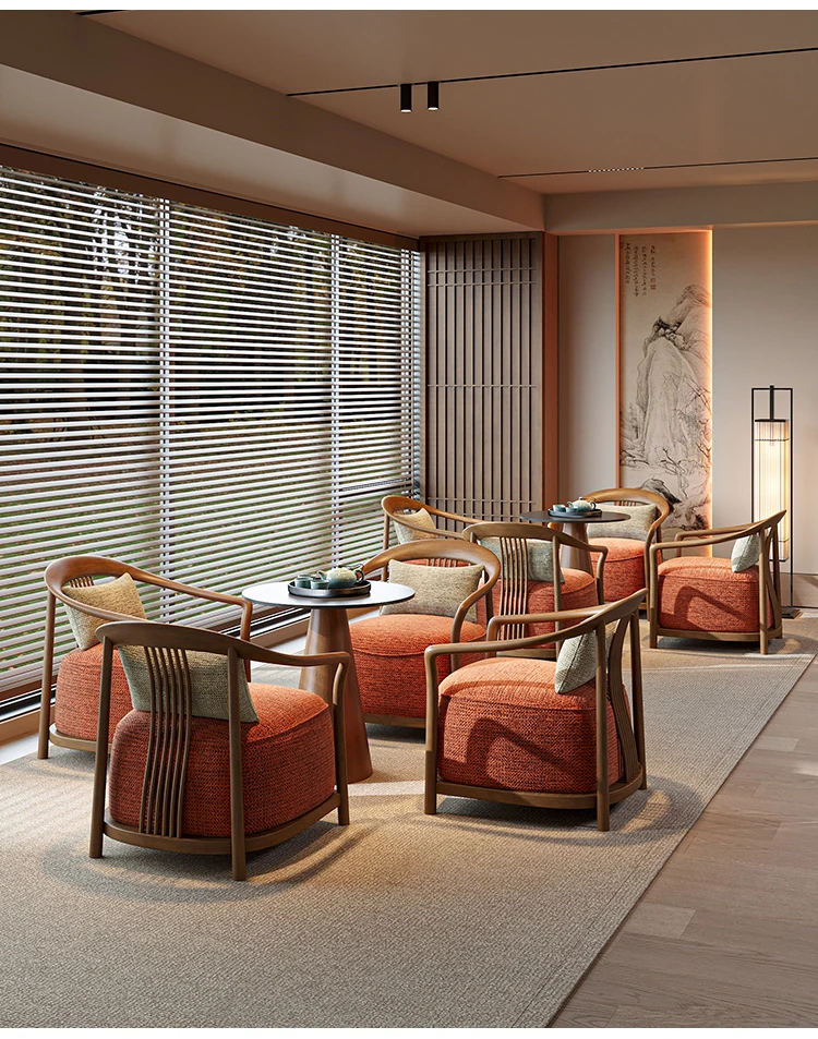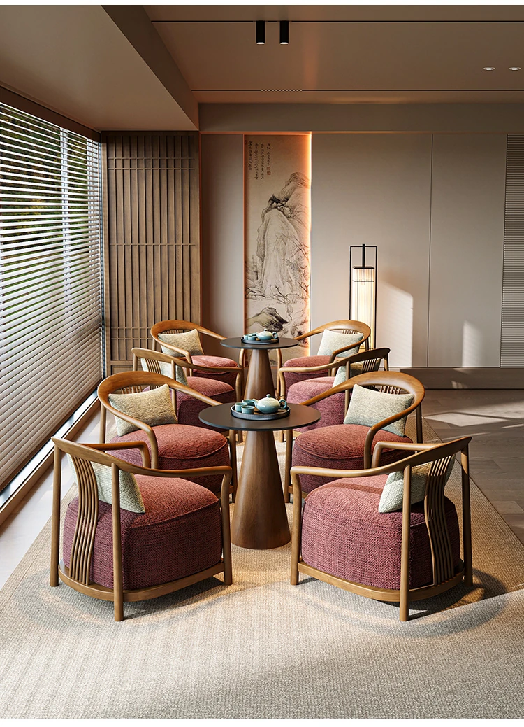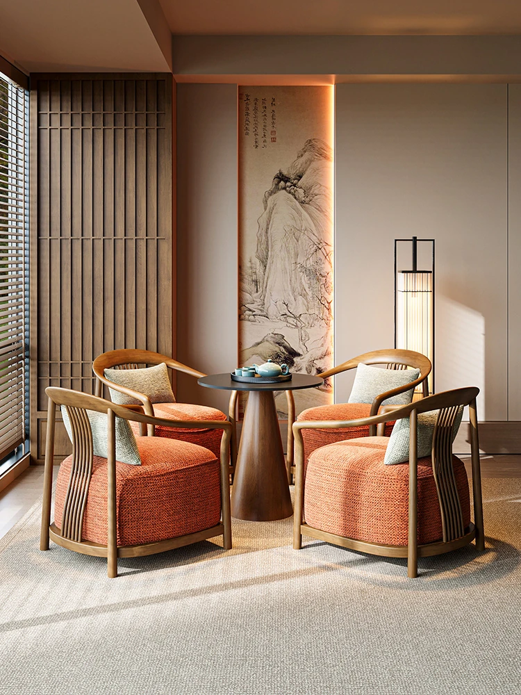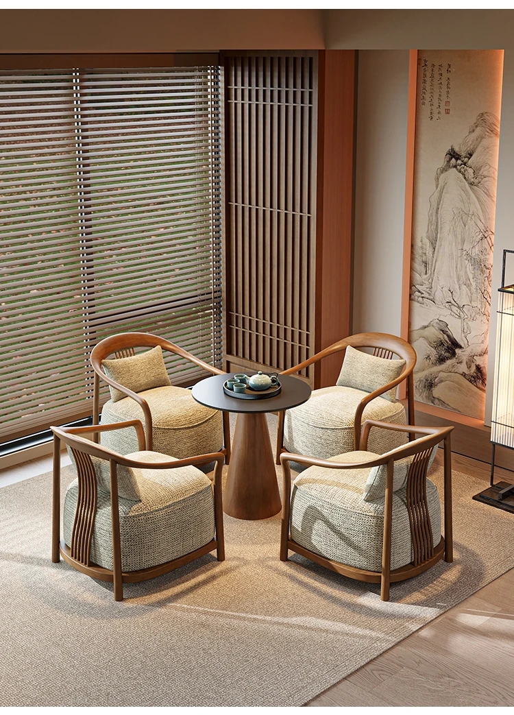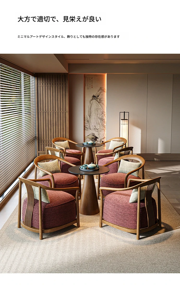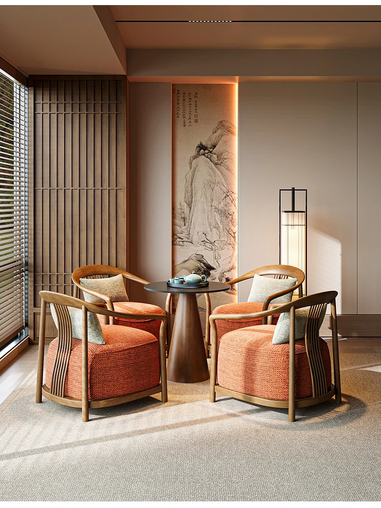 新中式デザインの高級ホテル用茶室ソファセット、民宿やホテルの受付に最適な実木製テーブル&チェアコンビネーション。おしゃれで快適な空間を演出し、ゲストをおもてなしします!