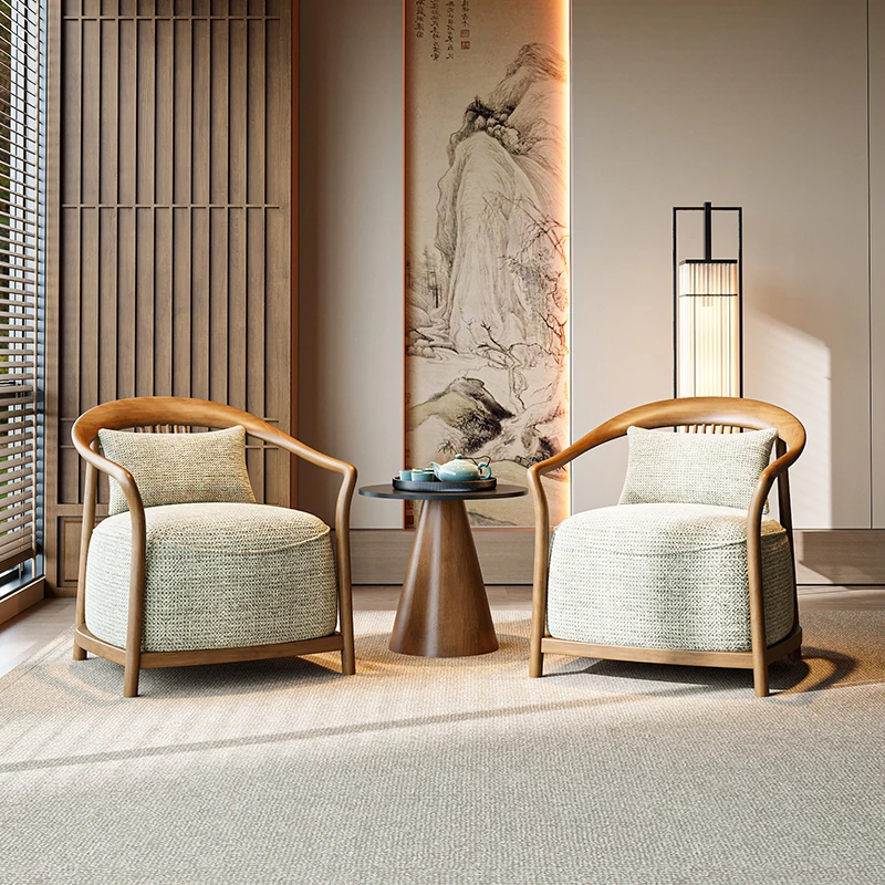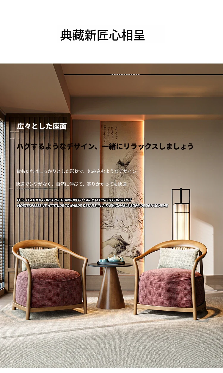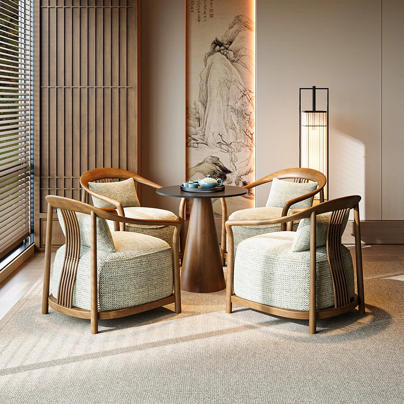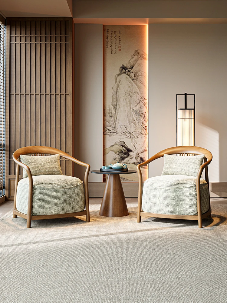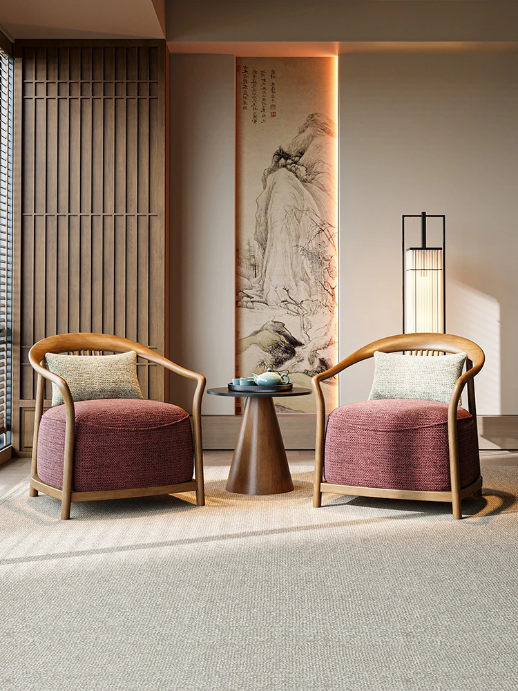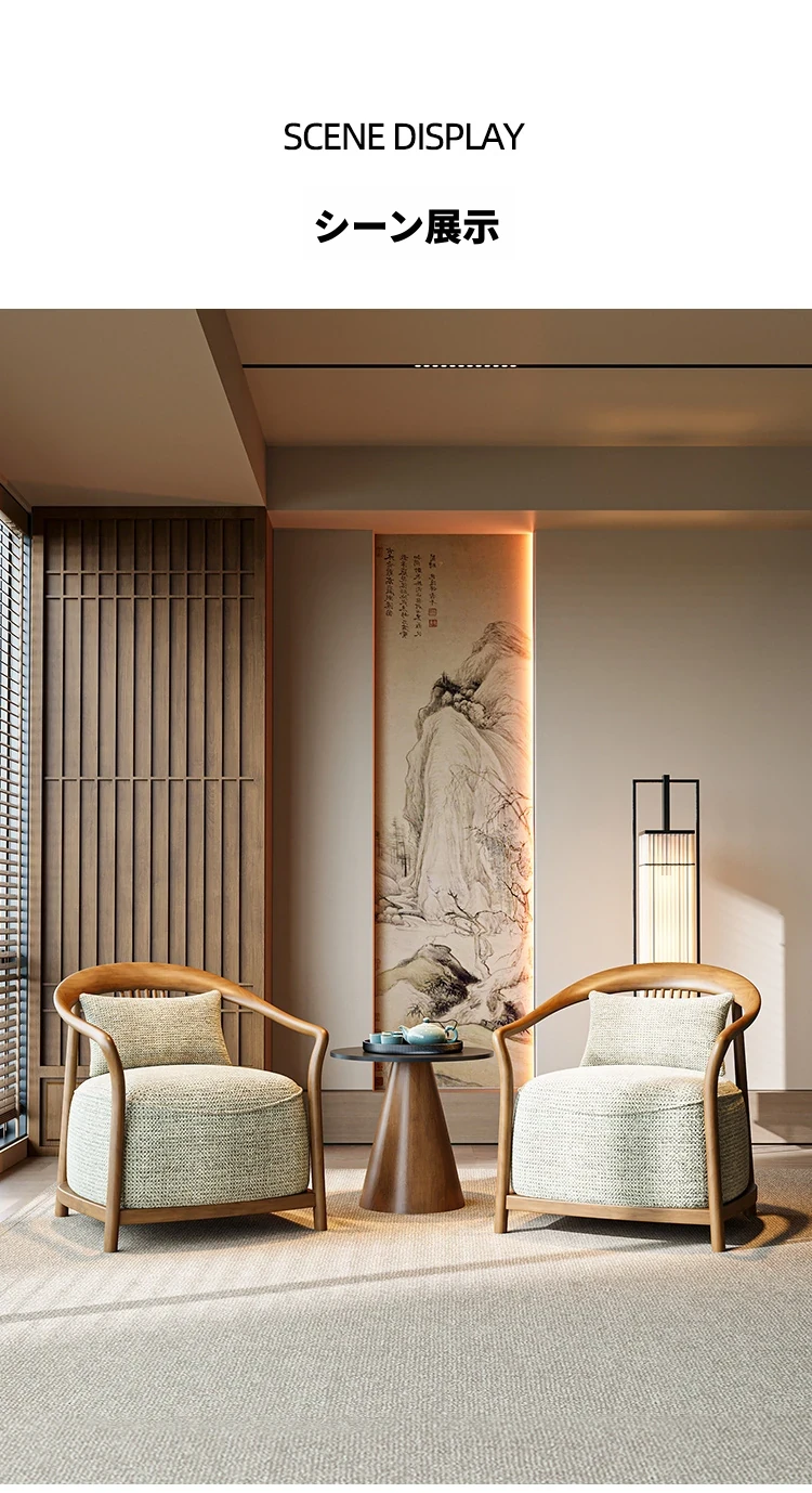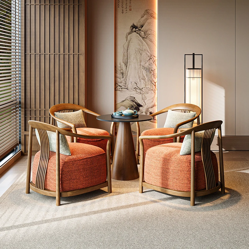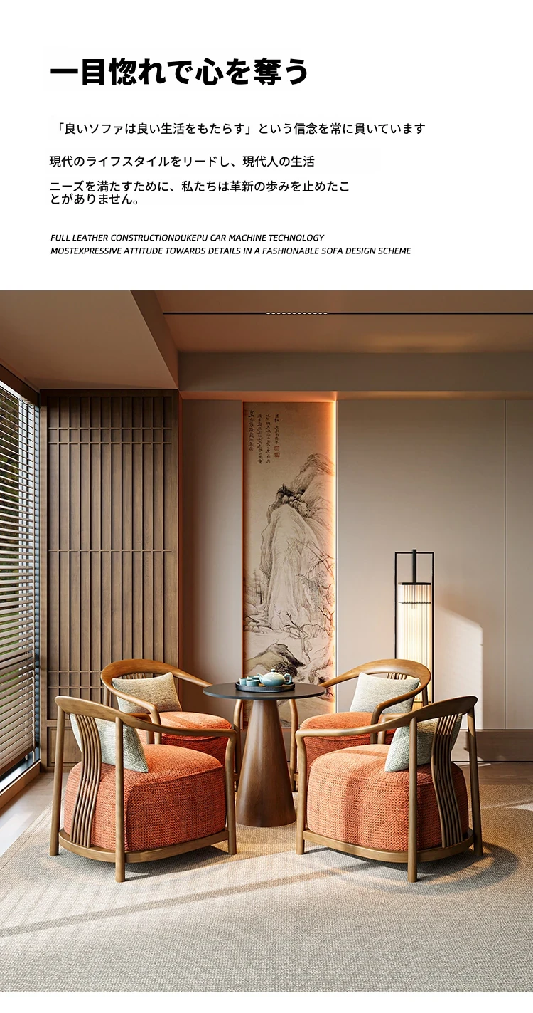 新中式デザインの高級ホテル用茶室ソファセット、民宿やホテルの受付に最適な実木製テーブル&チェアコンビネーション。おしゃれで快適な空間を演出し、ゲストをおもてなしします!