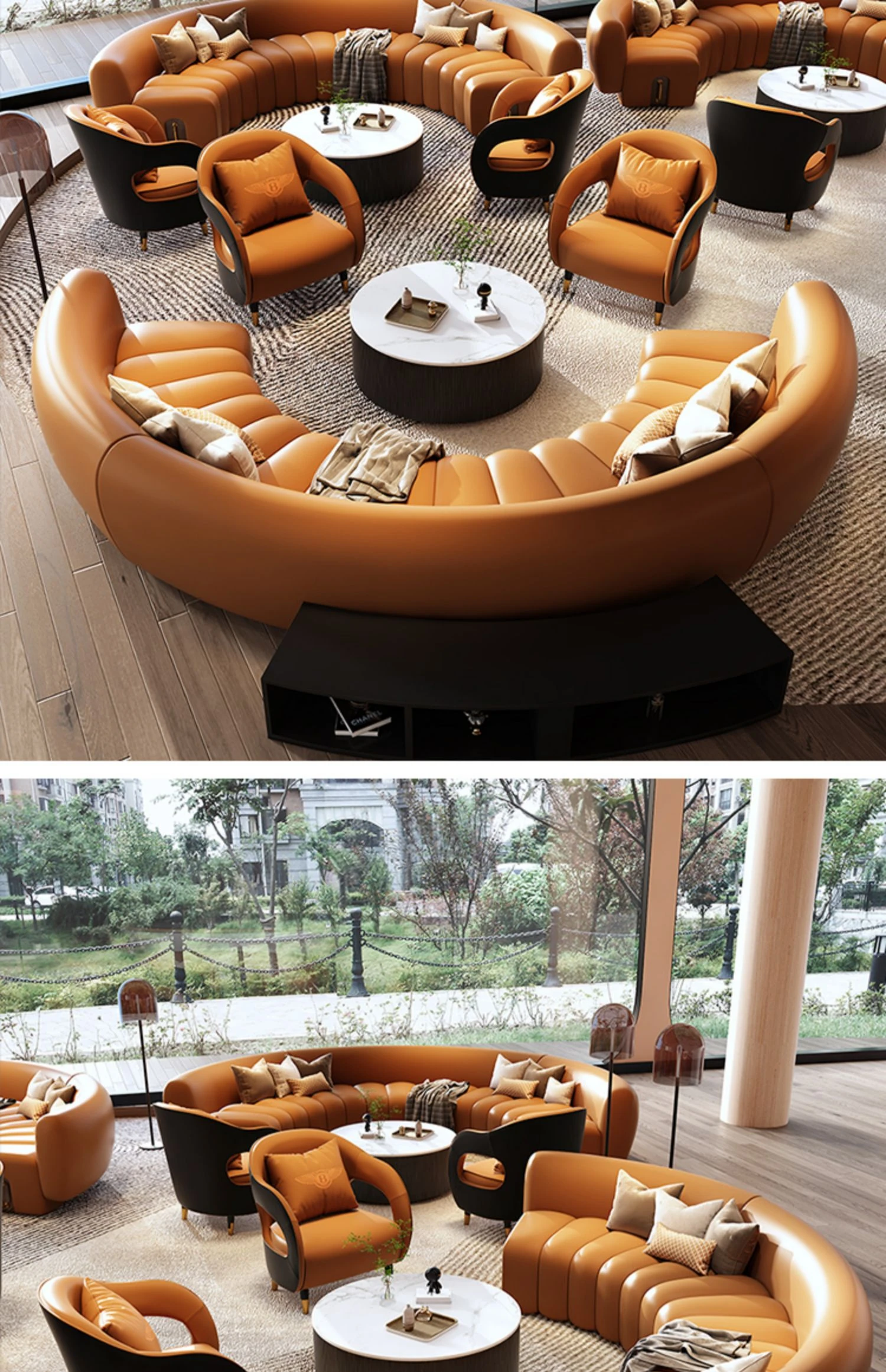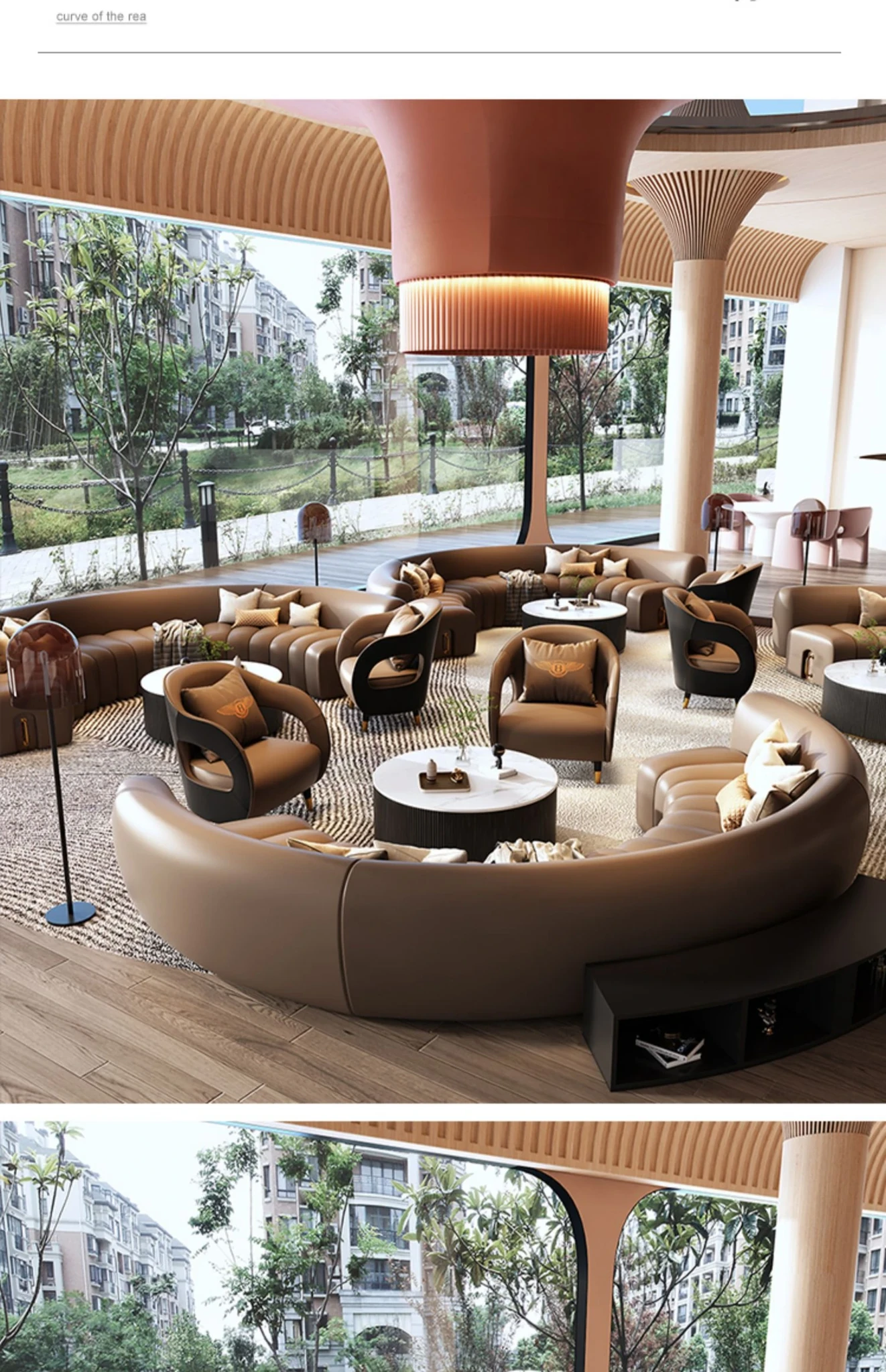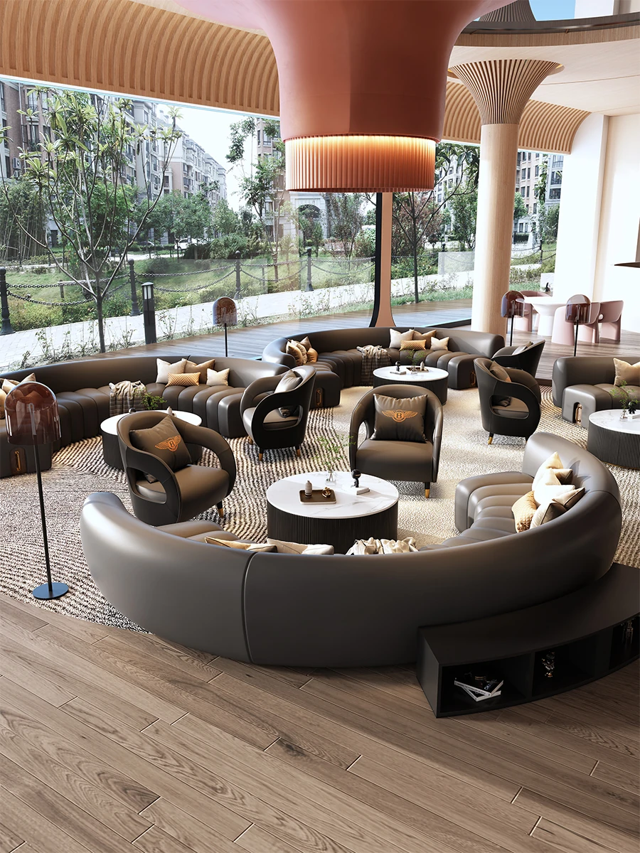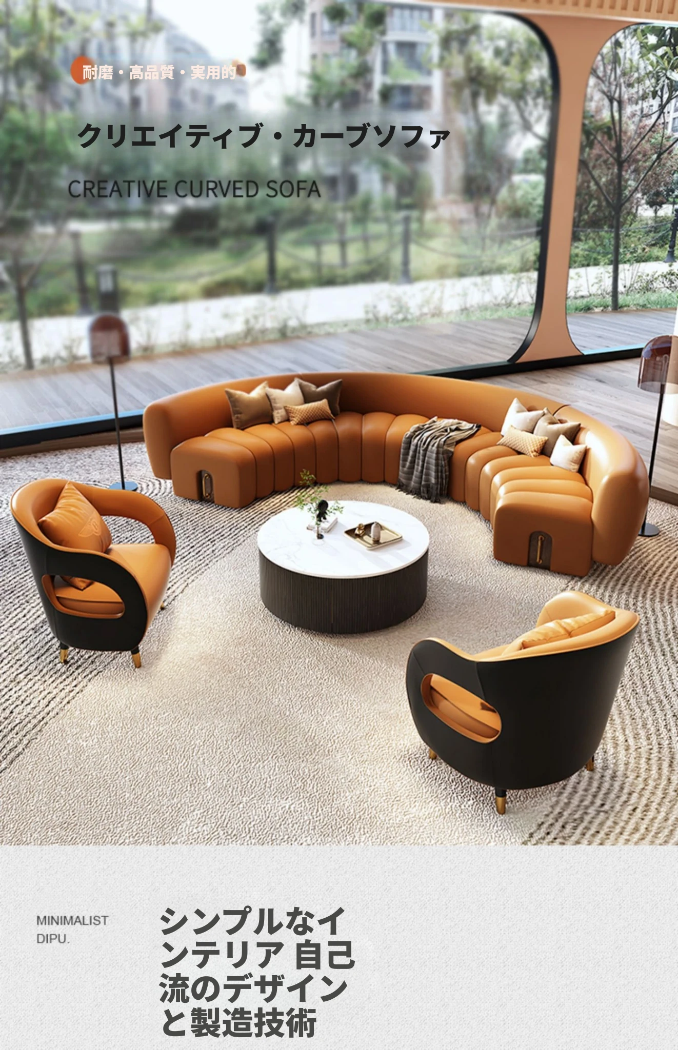 モダンシンプルなコーナーラウンドレザーソファ - ホテルロビー、バー、クラブに最適なハーフサークルのカスタマイズ可能な受付デスク&チェアセット!おしゃれで快適な空間を演出します。