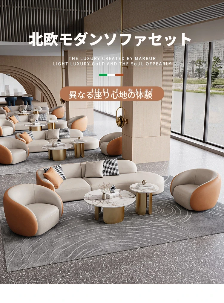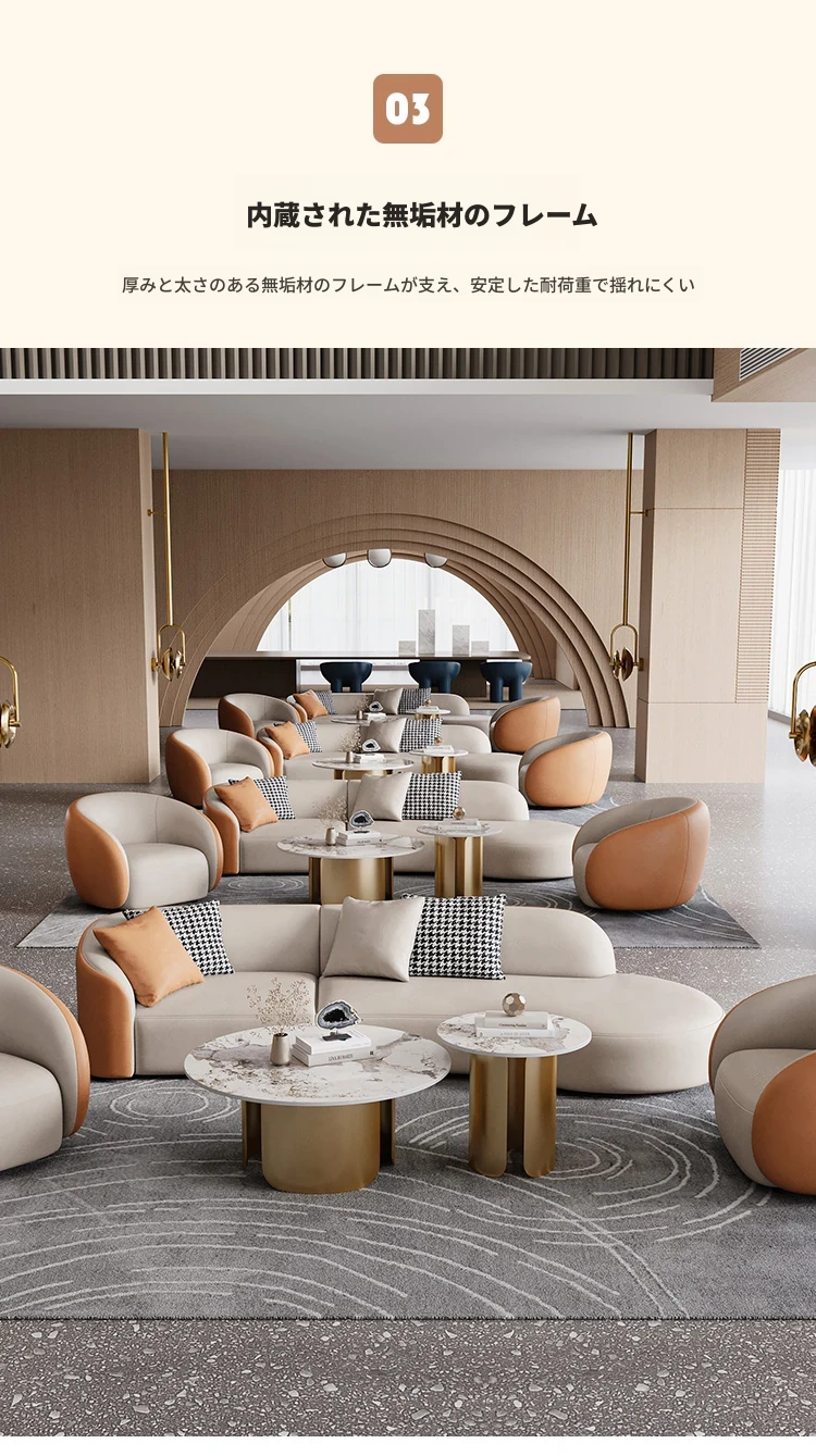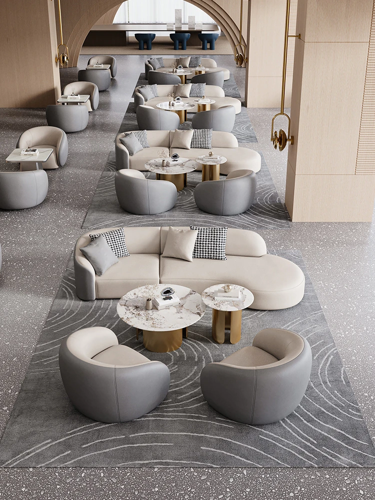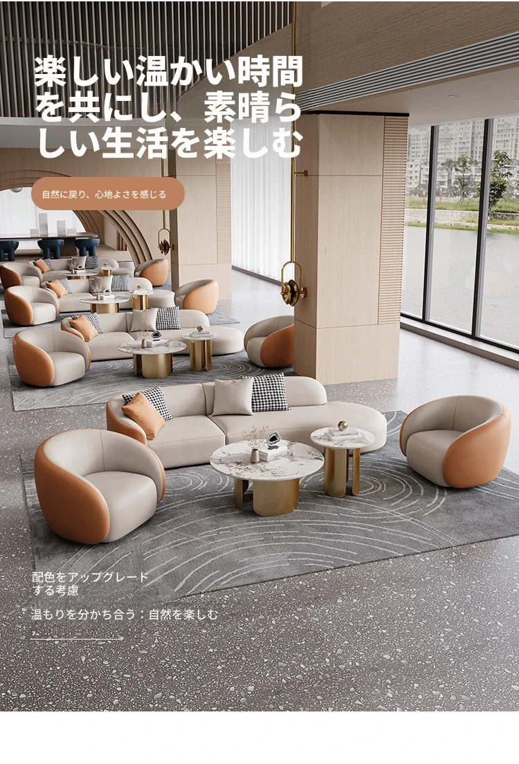 モダンミニマリストのホテルロビー用ラグジュアリーソファ&テーブルセット - 美容院の休憩エリアやVIPルームに最適なスタイリッシュな接客スペースをご提供します!