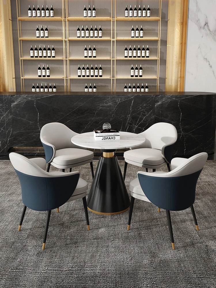 高級感あふれる軽奢スタイルの商談テーブルセット!現代的なホテルにぴったりな天然石製の小丸テーブルと4脚の椅子で、ビジネスミーティングをスタイリッシュに演出します。快適さと洗練されたデザインを兼ね備えた一品です。