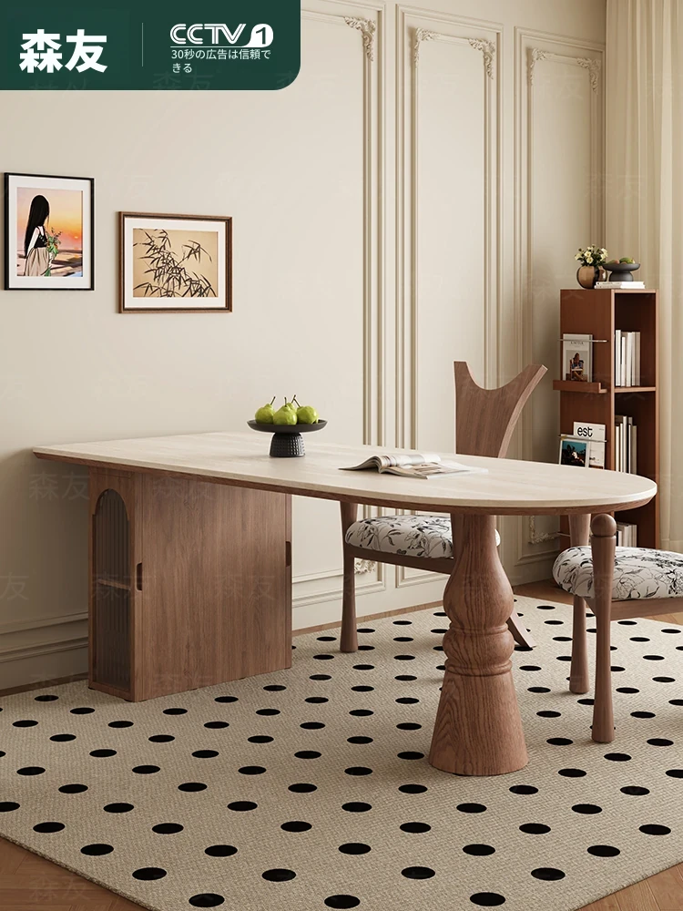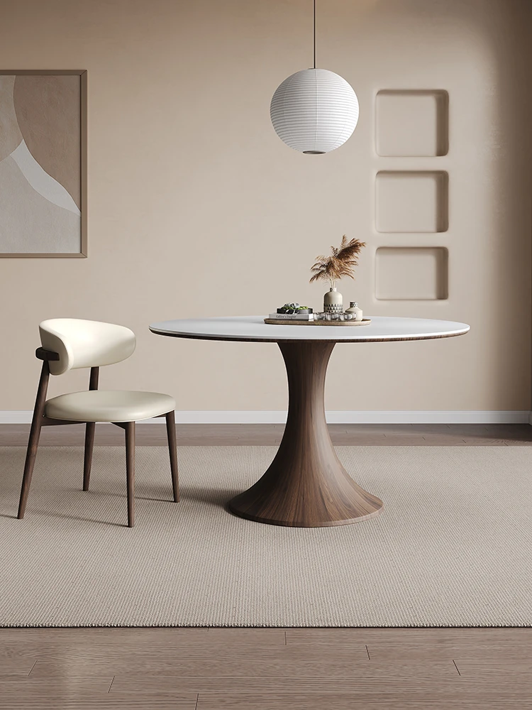 デリフォン無垢材ロックボードダイニングテーブル - 家庭向け小型シンプル純白デザイン、レトロな丸型食卓でおしゃれな食事空間を演出!