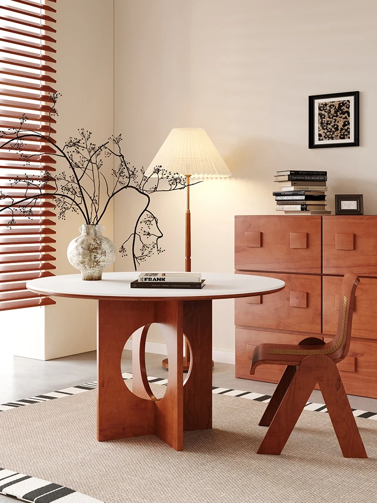 清源里のアンティーク風レトロな円形ダイニングテーブル - 岩板仕上げの小型家庭用シンプルな無垢材の丸テーブル、侘び寂びスタイルでおしゃれな空間を演出!