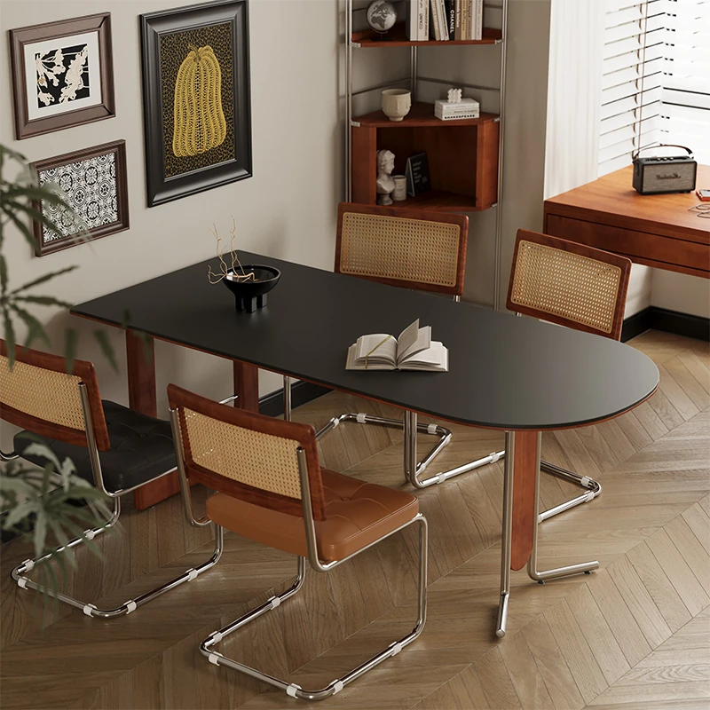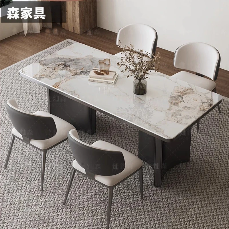 イタリアンスタイルの長方形岩板ダイニングテーブル|全て無垢材使用|4人用の軽奢スタイル|小さなスペースにもぴったりな食卓セット!快適な食事時間を演出します。
