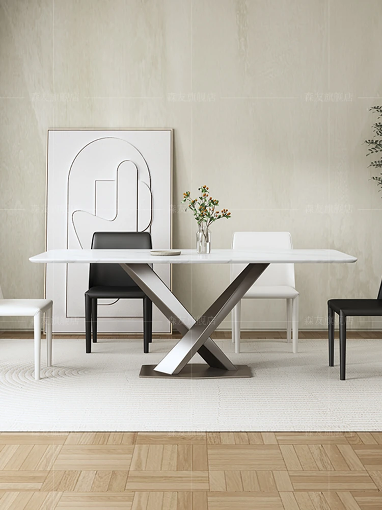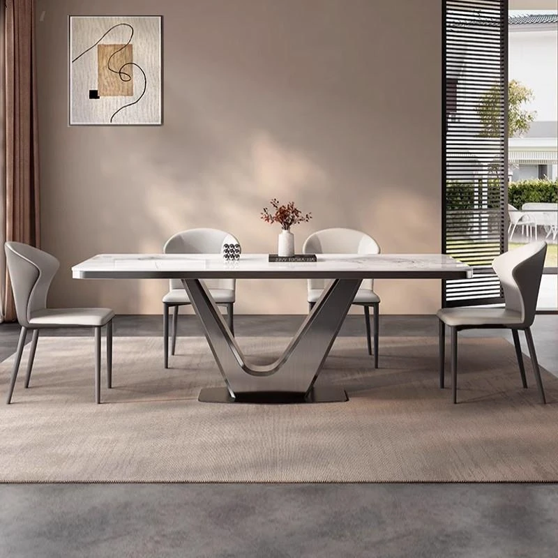 2025年最新モデル!スタイリッシュな長方形ステンレス製下掛け岩板ダイニングテーブル&チェアセット - モダンでシンプルなデザイン、小スペースにぴったりの軽やかなラグジュアリー感を実現!